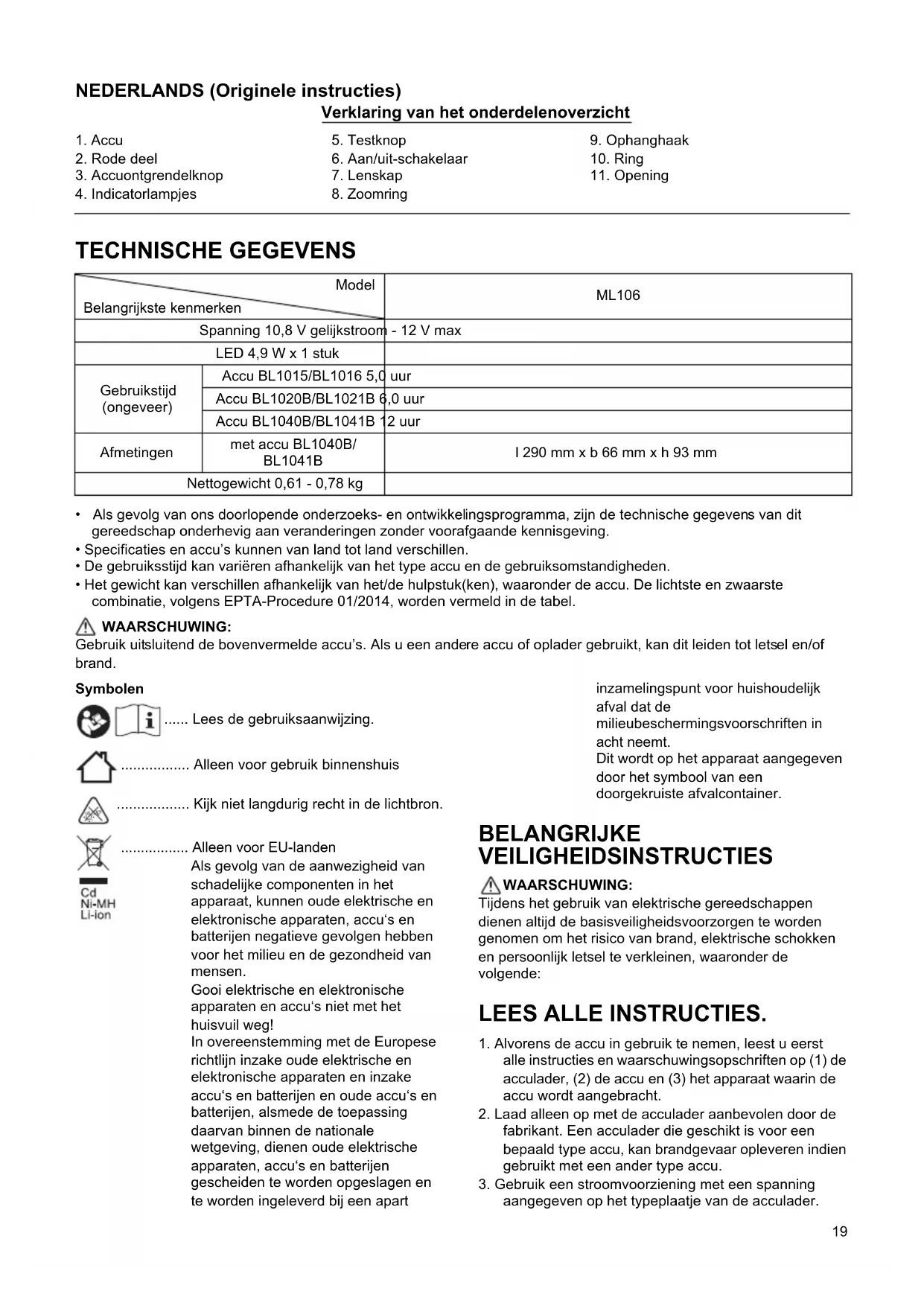 - Het gewicht kan verschillen afhankelijk van het/de hulpstuk(ken), waaronder de accu. De lichtste en zwaarste combinatie, volgens EPTA-Procedure 01/2014, worden vermeld in de tabel. WAARSCHUWING: Gebruik uitsluitend de bovenvermelde accu’s. Als u een andere accu of oplader gebruikt, kan dit leiden tot letsel en/of brand. Symbolen ...... Lees de gebruiksaanwijzing. ................. Alleen voor gebruik binnenshuis .................. Kijk niet langdurig recht in de lichtbron. ................. Alleen voor EU-landen Als gevolg van de aanwezigheid van schadelijke componenten in het apparaat, kunnen oude elektrische en elektronische apparaten, accu‘s en batterijen negatieve gevolgen hebben voor het milieu en de gezondheid van mensen. Gooi elektrische en elektronische apparaten en accu‘s niet met het huisvuil weg! In overeenstemming met de Europese richtlijn inzake oude elektrische en elektronische apparaten en inzake accu‘s en batterijen en oude accu‘s en batterijen, alsmede de toepassing daarvan binnen de nationale wetgeving, dienen oude elektrische apparaten, accu‘s en batterijen gescheiden te worden opgeslagen en te worden ingeleverd bij een apart inzamelingspunt voor huishoudelijk afval dat de milieubeschermingsvoorschriften in acht neemt. Dit wordt op het apparaat aangegeven door het symbool van een doorgekruiste afvalcontainer. BELANGRIJKE VEILIGHEIDSINSTRUCTIES WAARSCHUWING: Tijdens het gebruik van elektrische gereedschappen dienen altijd de basisveiligheidsvoorzorgen te worden genomen om het risico van brand, elektrische schokken en persoonlijk letsel te verkleinen, waaronder de volgende: LEES ALLE INSTRUCTIES.