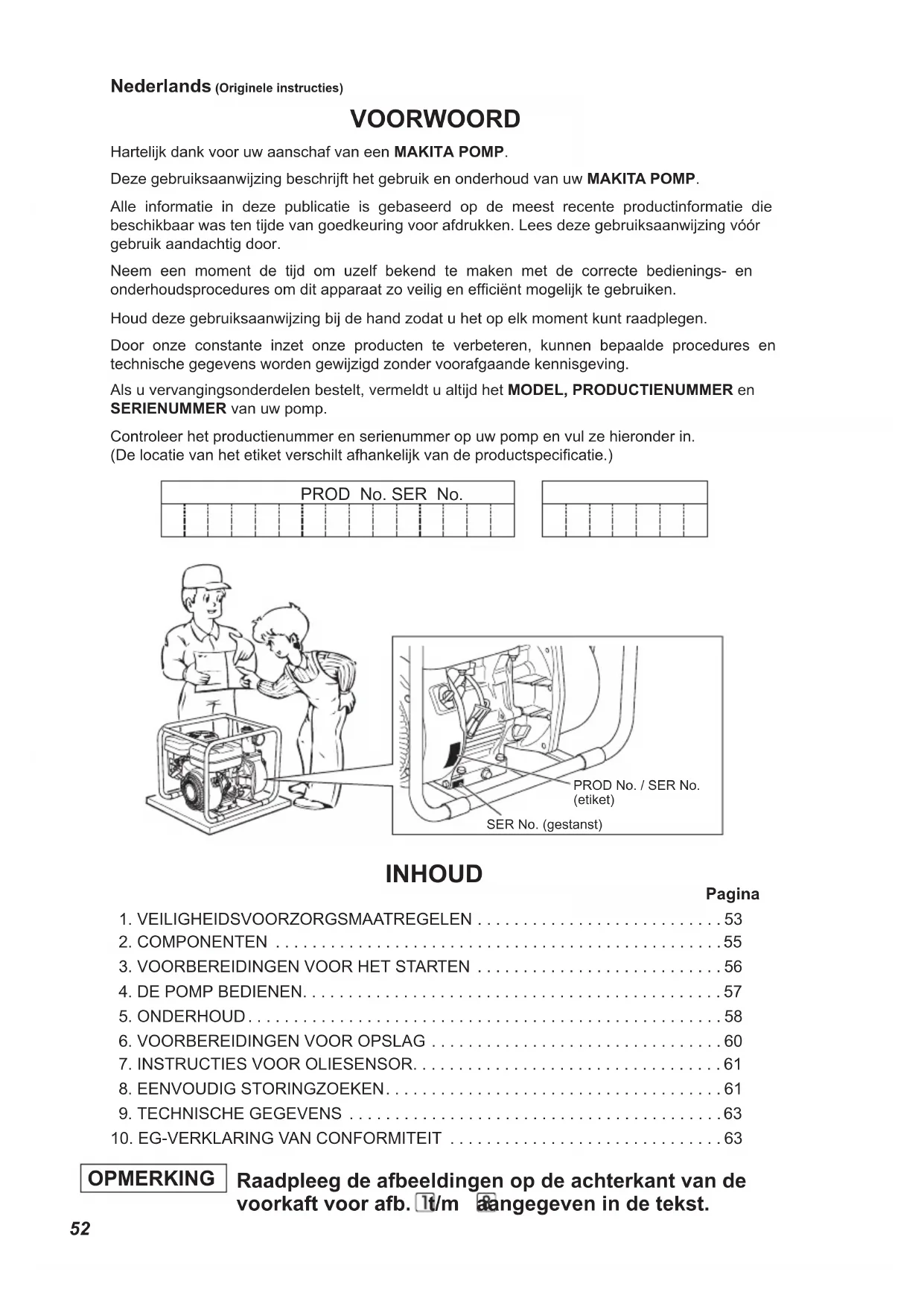 Marchio Livello di potenza sonora misurato Livello di potenza sonora garantito EW2050H 100 dB(A) 101 dB(A) EW3050H 103 dB(A) 103 dB(A) EW2051H 101 dB(A) 103 dB(A) EW3051H 104 dB(A) 105 dB(A) Questi livelli di rumore non hanno dimostrato necessariamente un livello di lavoro sicuro. Tuttavia, all’utente sarà consentita una migliore valutazione dei pericoli e dei rischi utilizzando le presenti informazioni. Nota: Il livello di rumore cambia in base ai dati tecnici. I dati tecnici sono soggetti a modiche senza preavviso.52 VOORWOORD Hartelijk dank voor uw aanschaf van een MAKITA POMP. Deze gebruiksaanwijzing beschrijft het gebruik en onderhoud van uw MAKITA POMP. Alle informatie in deze publicatie is gebaseerd op de meest recente productinformatie die beschikbaar was ten tijde van goedkeuring voor afdrukken. Lees deze gebruiksaanwijzing vóór gebruik aandachtig door.Neem een moment de tijd om uzelf bekend te maken met de correcte bedienings- en onderhoudsprocedures om dit apparaat zo veilig en efciënt mogelijk te gebruiken.Houd deze gebruiksaanwijzing bij de hand zodat u het op elk moment kunt raadplegen.Door onze constante inzet onze producten te verbeteren, kunnen bepaalde procedures en technische gegevens worden gewijzigd zonder voorafgaande kennisgeving.Als u vervangingsonderdelen bestelt, vermeldt u altijd het MODEL, PRODUCTIENUMMER en SERIENUMMER van uw pomp.Controleer het productienummer en serienummer op uw pomp en vul ze hieronder in. (De locatie van het etiket verschilt afhankelijk van de productspecicatie.) PROD No. SER No. PROD No. / SER No.(etiket)SER No. (gestanst) Raadpleeg de afbeeldingen op de achterkant van de voorkaft voor afb. t/m aangegeven in de tekst. OPMERKING INHOUD Pagina