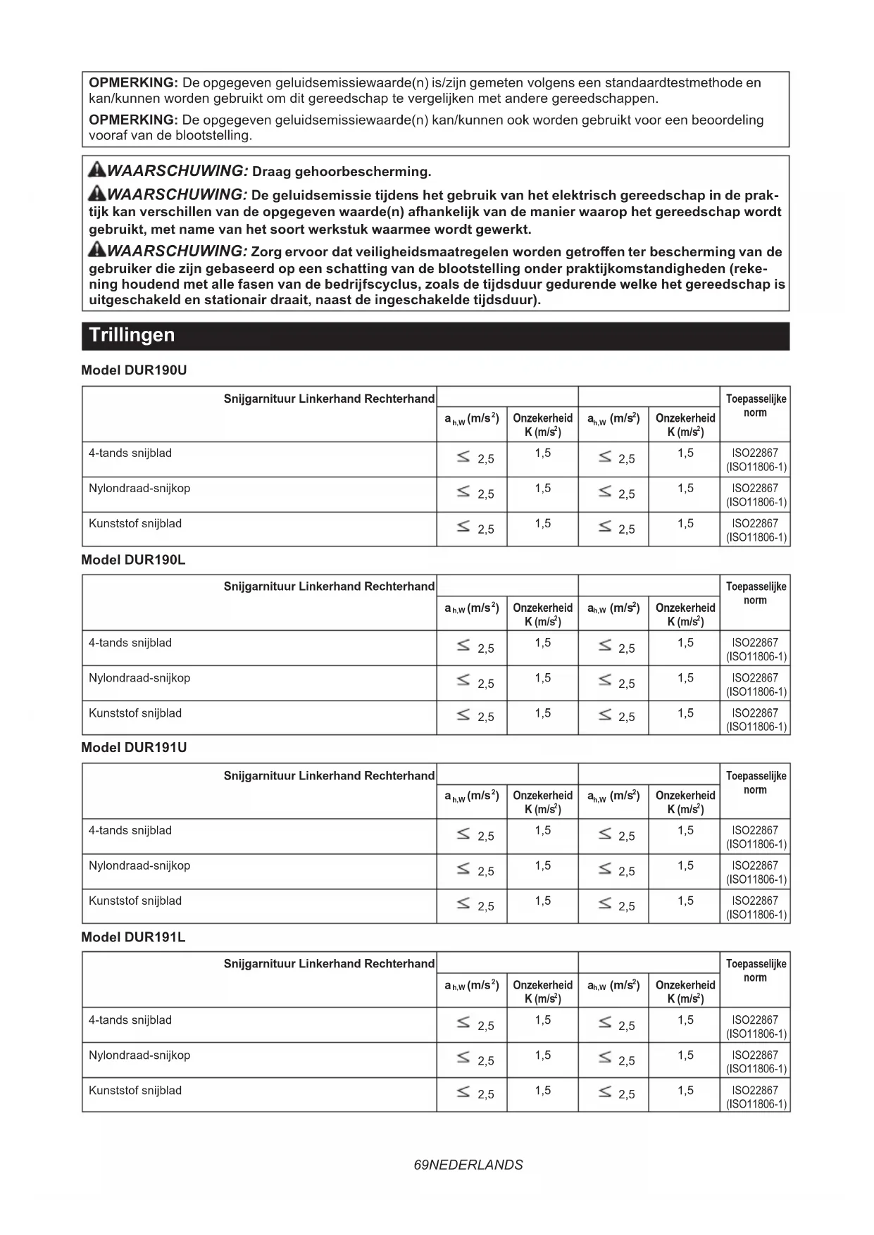 - Zelfsalshetbovenvermeldegeluidsdrukniveau80dB(A)ofminderis,kanhetniveautijdensbedrijfhogerzijn dan 80 dB (A). Draag gehoorbescherming.69 NEDERLANDS OPMERKING:Deopgegevengeluidsemissiewaarde(n)is/zijngemetenvolgenseenstandaardtestmethodeen kan/kunnenwordengebruiktomditgereedschaptevergelijkenmetanderegereedschappen. OPMERKING: De opgegeven geluidsemissiewaarde(n) kan/kunnen ook worden gebruikt voor een beoordeling vooraf van de blootstelling. WAARSCHUWING: Draag gehoorbescherming. WAARSCHUWING: De geluidsemissie tijdens het gebruik van het elektrisch gereedschap in de prak- tijk kan verschillen van de opgegeven waarde(n) afhankelijk van de manier waarop het gereedschap wordt gebruikt, met name van het soort werkstuk waarmee wordt gewerkt. WAARSCHUWING: Zorg ervoor dat veiligheidsmaatregelen worden getroen ter bescherming van de gebruiker die zijn gebaseerd op een schatting van de blootstelling onder praktijkomstandigheden (reke- ning houdend met alle fasen van de bedrijfscyclus, zoals de tijdsduur gedurende welke het gereedschap is uitgeschakeld en stationair draait, naast de ingeschakelde tijdsduur). Trillingen Model DUR190U Snijgarnituur Linkerhand Rechterhand Toepasselijke norm