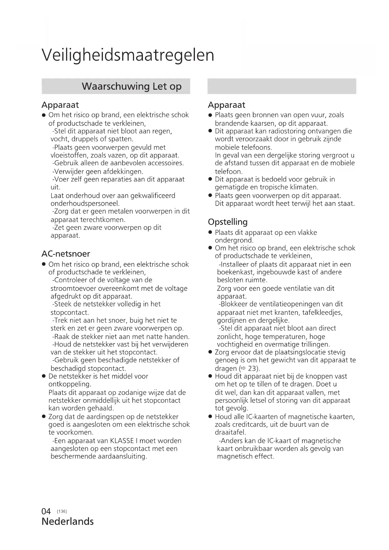 Om het risico op brand, een elektrische schok of productschade te verkleinen, -Stel dit apparaat niet bloot aan regen, vocht, druppels of spatten. -Plaats geen voorwerpen gevuld met vloeistoffen, zoals vazen, op dit apparaat. -Gebruik alleen de aanbevolen accessoires. -Verwijder geen afdekkingen. -Voer zelf geen reparaties aan dit apparaat uit. Laat onderhoud over aan gekwalificeerd onderhoudspersoneel. -Zorg dat er geen metalen voorwerpen in dit apparaat terechtkomen. -Zet geen zware voorwerpen op dit apparaat. AC-netsnoer