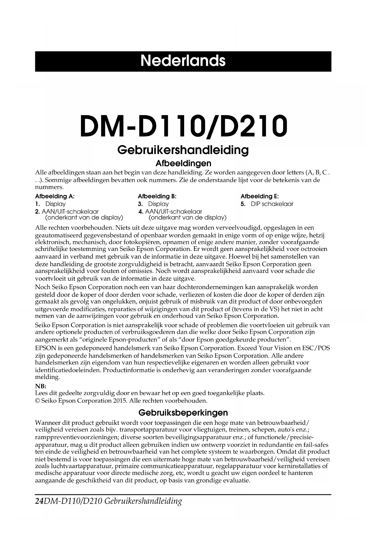 2. AAN/UIT-schakelaar (onderkant van de display)4. AAN/UIT-schakelaar (onderkant van de display)DM-D110/D210 Gebruikershandleiding 25 Veiligheidsmaatregelen Dit gedeelte bevat belangrijke informatie voor veilig en effectief gebruik van dit product. Lees dit gedeelte zorgvuldig door en bewaar het op een goed toegankelijke plaats. WAARSCHUWING: Uw apparaat onmiddellijk uitschakelen wanneer het rook, een vreemde geur of ongebruikelijk geluid produceert. Verder gebruik kan brand veroorzaken. Trek onmiddellijk de stekker uit het stopcontact en neem daarna contact op met uw leverancier of een servicecentrum van Seiko Epson voor advies. Niet proberen om zelf dit product te repareren. Onjuist uitgevoerde reparaties kunnen gevaarlijk zijn. Dit product nooit demonteren of modificeren. Wijzigen van dit product kan letsel of brand veroorzaken. Gebruik alleen de aangegeven voedingsbron. Aansluiten op een verkeerde voedingsbron kan brand veroorzaken. Voorkom dat er voorwerpen in de apparatuur vallen. Binnendringen van vreemde voorwerpen kan brand veroorzaken. Als er water of andere vloeistoffen in deze apparatuur wordt gemorst, verwijder dan onmiddellijk alle kabels en neem daarna contact op met uw leverancier of een servicecentrum van Seiko Epson voor advies. LET OP: De kabels niet op een andere wijze aansluiten dan als vermeld in deze handleiding. Verkeerde aansluitingen kunnen apparatuurschade en brand veroorzaken. Plaats deze apparatuur op een stevig, stabiel, horizontaal oppervlak. Het product kan beschadigen of letsel veroorzaken als het valt. Niet gebruiken op plaatsen met een hoge vochtigheidsgraad of veel stof. Overmatig vocht en stof kunnen apparatuurschade of brand veroorzaken. Geen zware voorwerpen boven op dit product plaatsen. Nooit op het product staan of er tegen leunen. De apparatuur kan defect raken of in elkaar klappen, wat breuk en eventueel letsel kan veroorzaken. Niet meer dan één verlengsteun aansluiten. Als het omvalt kan het apparatuurschade of letsel veroorzaken. De horizontale draaibeweging van de display is door een stop beperkt. Gebruik geen overmatige kracht om de display verder te draaien dan de limiet die is ingesteld door de stop. Dat kan apparatuurschade veroorzaken. Als u een kabel aansluit of verwijderd, controleer dan altijd of de aan/uit- schakelaars van de klantendisplay en de aangesloten unit uit staan. Let op dat u de klantendisplay tijdens gebruik niet laat vallen of omgooit omdat het een ingebouwde fluorescerende lamp bevat. Als u het product gedurende een langere tijd niet gebruikt, verwijder dan altijd alle kabels voor de veiligheid. Als u het product wilt verplaatsen, zorg er dan voor dat alle kabels zijn verwijderd voordat u het verplaatst. Geen spuitbussen met brandgevaarlijk gas in of bij dit product gebruiken. Dat kan brand veroorzaken.26 DM-D110/D210 Gebruikershandleiding Overzicht DM-D110/DM-D210 is een compact klantendisplay. Afhankelijk van uw omgeving kunt u een seriële-kabel of USB-kabel gebruiken. Onderdeelnamen Zie afbeeldingen A tot E. Opties Alle opties worden gebruikt afhankelijk van de manier waarop het product wordt geïnstalleerd. ❏ DP-110: DM-D110 voet. Zie afbeelding A. ❏ DP-210: DM-D210 voet. Zie afbeelding B. ❏ DP-502: Montagebeugel voor DM-D110/DM-D210 (voor TM printer). Zie afbeelding C. Downloaden van stuur- en hulpprogramma’s en gebruiksaanwijzingen De meest recente versies van stuur- en hulpprogramma’s en gebruiksaanwijzingen kunnen van een van de volgende URL’s gedownload worden. Klanten in Noord-Amerika kunnen gebruik maken van de volgende website: http://www.epsonexpert.com/ en de instructies op het scherm volgen. Klanten in andere landen kunnen gebruik maken van de volgende website: https://download.epson-biz.com/?service=po Voorzorgsmaatregelen tijdens opstarten Zorg ervoor dat u alle apparatuur die is aangesloten op dit product uitschakelt voordat u de kabels aansluit. Wanneer u de AC adapter aansluit op de DP-110/DP-210 DM-D110/DM-D210 start op zodra de aan/uit-schakelaar van de DM-D110/DM- D210 wordt ingeschakeld. Schakel altijd eerst de schakelaar van de DM-D110/DM-D210 in, voordat u de andere aangesloten apparatuur inschakelt. NB: Als het USB model van de EPSON TM printer is aangesloten, is het mogelijk dat het systeem de DM-D110/DM-D210 niet kan detecteren als de voeding van de DM-D110/ DM-D210 te laat wordt ingeschakeld. Wanneer u de USB voeding* aansluit op de DM-D110 De DM-D110 werkt overeenkomstig de aan/uit status van de voeding aan de host kant, ongeacht de stand van de DM-D110 aan/uit-schakelaar.