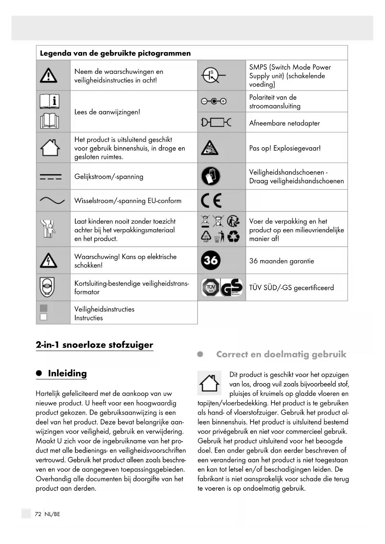PAP Voer de verpakking en het product op een milieuvriendelijke manier af! Waarschuwing! Kans op elektrische schokken! 36 maanden garantie Kortsluiting-bestendige veiligheidstrans- formator TÜV SÜD/-GS gecertificeerd Veiligheidsinstructies Instructies 2-in-1 snoerloze stofzuiger Inleiding Hartelijk gefeliciteerd met de aankoop van uw nieuwe product. U heeft voor een hoogwaardig product gekozen. De gebruiksaanwijzing is een deel van het product. Deze bevat belangrijke aan- wijzingen voor veiligheid, gebruik en verwijdering. Maakt U zich voor de ingebruikname van het pro- duct met alle bedienings- en veiligheidsvoorschriften vertrouwd. Gebruik het product alleen zoals beschre- ven en voor de aangegeven toepassingsgebieden. Overhandig alle documenten bij doorgifte van het product aan derden. Correct en doelmatig gebruik Dit product is geschikt voor het opzuigen van los, droog vuil zoals bijvoorbeeld stof, pluisjes of kruimels op gladde vloeren en tapijten/vloerbedekking. Het product is te gebruiken als hand- of vloerstofzuiger. Gebruik het product al- leen binnenshuis. Het product is uitsluitend bestemd voor privégebruik en niet voor commercieel gebruik. Gebruik het product uitsluitend voor het beoogde doel. Een ander gebruik dan eerder beschreven of een verandering aan het product is niet toegestaan en kan tot letsel en/of beschadigingen leiden. De fabrikant is niet aansprakelijk voor schade die terug te voeren is op ondoelmatig gebruik.73 NL/BE Beschrijving van de onderdelen