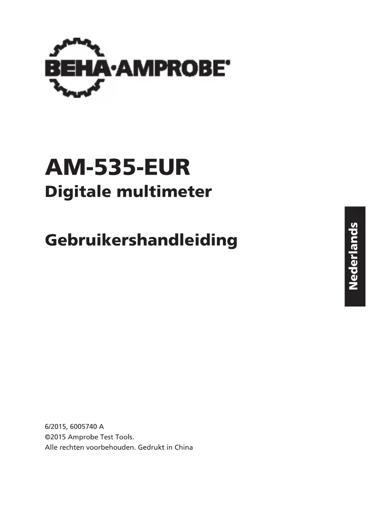 Digitale multimeter Gebruikershandleiding 6/2015, 6005740 A ©2015 Amprobe Test Tools. Alle rechten voorbehouden. Gedrukt in China NederlandsBeperkte garantie en beperking van aansprakelijkheid Uw Amprobe-product is vrij van defecten in materiaal en fabricage gedurende één jaar vanaf de aankoopdatum behalve wanneer de plaatselijke wetgeving anders vereist. Deze garantie dekt geen zekeringen, wegwerpbatterijen of schade door ongelukken, verwaarlozing, misbruik, verandering, vervuiling, of abnormale gebruiksomstandigheden. Wederverkopers zijn niet geautoriseerd tot het verlengen van andere garanties namens Amprobe. Om tijdens de garantieperiode service te verkrijgen, moet u het product met aankoopbewijs terugsturen naar een geautoriseerd Amprobe Service Center of naar een dealer of distributeur van Amprobe. Zie de reparatiesectie voor details. DEZE GARANTIE IS UW ENIGE REMEDIE. ALLE ANDERE GARANTIES - ZIJ HET UITDRUKKELIJK, IMPLICIET OF WETTELIJK - INCLUSIEF IMPLICIETE GARANTIE VOOR GESCHIKTHEID VOOR EEN BEPAALD DOEL OF VERKOOPBAARHEID, WORDEN HIERBIJ AFGEWEZEN. DE FABRIKANT IS NIET AANSPRAKELIJK VOOR ENIGE SPECIALE, INDIRECTE, INCIDENTELE OF GEVOLGSCHADE OF VERLIES VOORTVLOEIEND UIT ENIGE OORZAAK OF REGELS. Omdat sommige staten en landen het uitsluiten of beperken van een impliciete garantie of van incidentele of gevolgschade niet toestaan, is deze beperking van de aansprakelijkheid mogelijk niet op u van toepassing. Reparatie Bij alle testgereedschappen die worden teruggezonden voor reparatie al dan niet onder garantie of voor kalibratie, moet het volgende worden meegezonden:uw naam, bedrijfsnaam, adres, telefoonnummer, en aankoopbewijs. Neem daarnaast een korte omschrijving op van het probleem of de gevraagde dienst en stuur de testsnoeren met de meter mee. Kosten voor reparatie of vervanging die niet onder garantie plaatsvinden, moeten worden betaald in de vorm van een cheque, een betalingsopdracht, een credit card met verloopdatum of een aankooporder betaalbaar gesteld aan Amprobe. Reparatie en vervanging onder garantie - alle landen Lees de garantiebepalingen en controleer de batterij voordat u reparatie aanvraagt. Tijdens de garantieperiode kunt u elk defect testgereedschap retourneren naar uw Amprobe- distributeur om dit om te ruilen voor hetzelfde of een gelijksoortig product. Zie de sectie "Waar te kopen" op www.Amprobe.com voor een lijst met distributeurs in uw omgeving. Daarnaast kunt u in de Verenigde Staten en Canada eenheden voor reparatie en vervanging onder garantie tevens sturen naar een Amprobe Service Center (zie het adres hierna). Reparatie en vervangingen buiten garantie - Verenigde Staten en Canada Reparaties die niet onder de garantie vallen in de Verenigde Staten en Canada moet u sturen naar een Amprobe Service Center. Bel Amprobe of informeer bij uw verkoper naar de actuele kosten voor reparatie en vervanging. VS: Canada: Amprobe Amprobe Everett, WA 98203 Mississauga, ON L4Z 1X9 Tel: 877-AMPROBE (267-7623) Tel: 905-890-7600 Reparatie en vervangingen buiten garantie - Europa Europese eenheden die niet onder de garantie vallen, kunnen tegen nominale kosten vervangen worden door uw Amprobe -distributeur. Zie de sectie "Waar te kopen" op www.Beha-Amprobe.com voor een lijst met distributeurs in uw omgeving. Amprobe Europe* Beha-Amprobe In den Engematten 14 79286 Glottertal, Duitsland Tel: +49 (0) 7684 8009 - 0 www.Beha-Amprobe.com