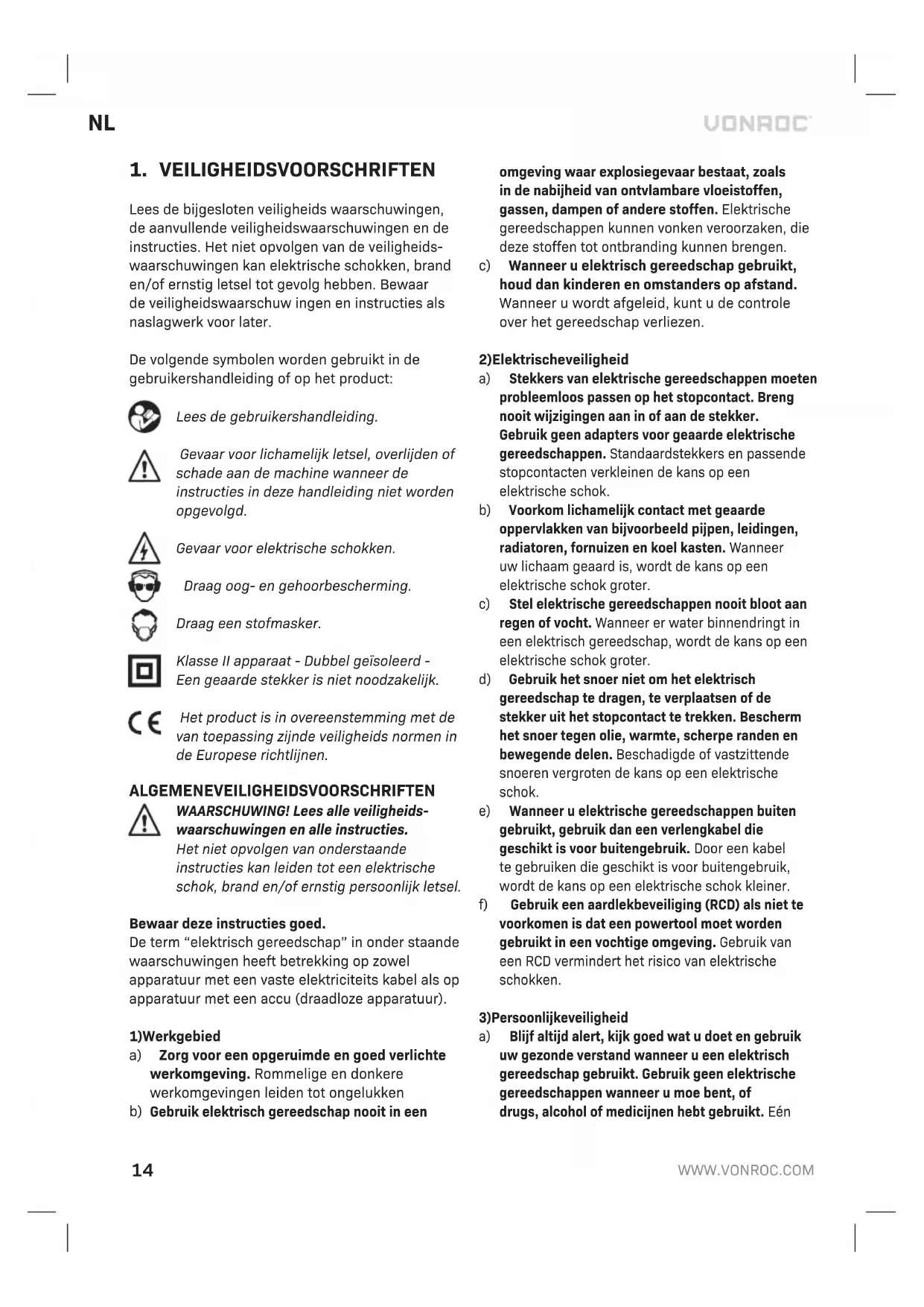 Zorg dat de machine niet onder spanning staat wanneer onderhoudswerkzaamheden aan het mechaniek worden uitgevoerd. Reinig de machinebehuizing regelmatig met een zachte doek, bij voorkeur iedere keer na gebruik. Zorg dat de ventilatiesleuven vrij van stof en vuil zijn. Gebruik bij hardnekkig vuil een zachte doek bevochtigd met zeepwater. Gebruik geen oplosmid- delen als benzine, alcohol, ammonia, etc. Dergelij- ke stoffen beschadigen de kunststof onderdelen. MILIEU Defecte en/of afgedankte elektrische of elektronische gereedschappen dienen ter verwerking te worden aangeboden aan een daarvoor verantwoordelijke instantie. Uitsluitend voor EG-landen Werp elektrisch gereedschap niet weg bij het huisvuil. Conform de Europese Richtlijn 2012/19/ EG voor Afgedankte Elektrische en Elektronische Apparatuur en de implementatie ervan in nationaal recht moet niet langer te gebruiken elektrisch gereedschap gescheiden worden verzameld en op een milieuvriendelijke wijze worden verwerkt. GARANTIE VONROC producten zijn ontworpen volgens de hoogste kwaliteitsstandaarden en gegarandeerd vrij van defecten, zowel materieel als fabrieksfouten, tijdens de wettelijk vastgestelde garantieperiode vanaf de eerste aankoopdatum. Mocht het product tijdens deze periode gebreken vertonen veroorzaakt door defecte materialen en/of fabrieksfouten, neem dan rechtstreeks contact op met VONROC. De volgende situaties vallen niet onder de garantie: