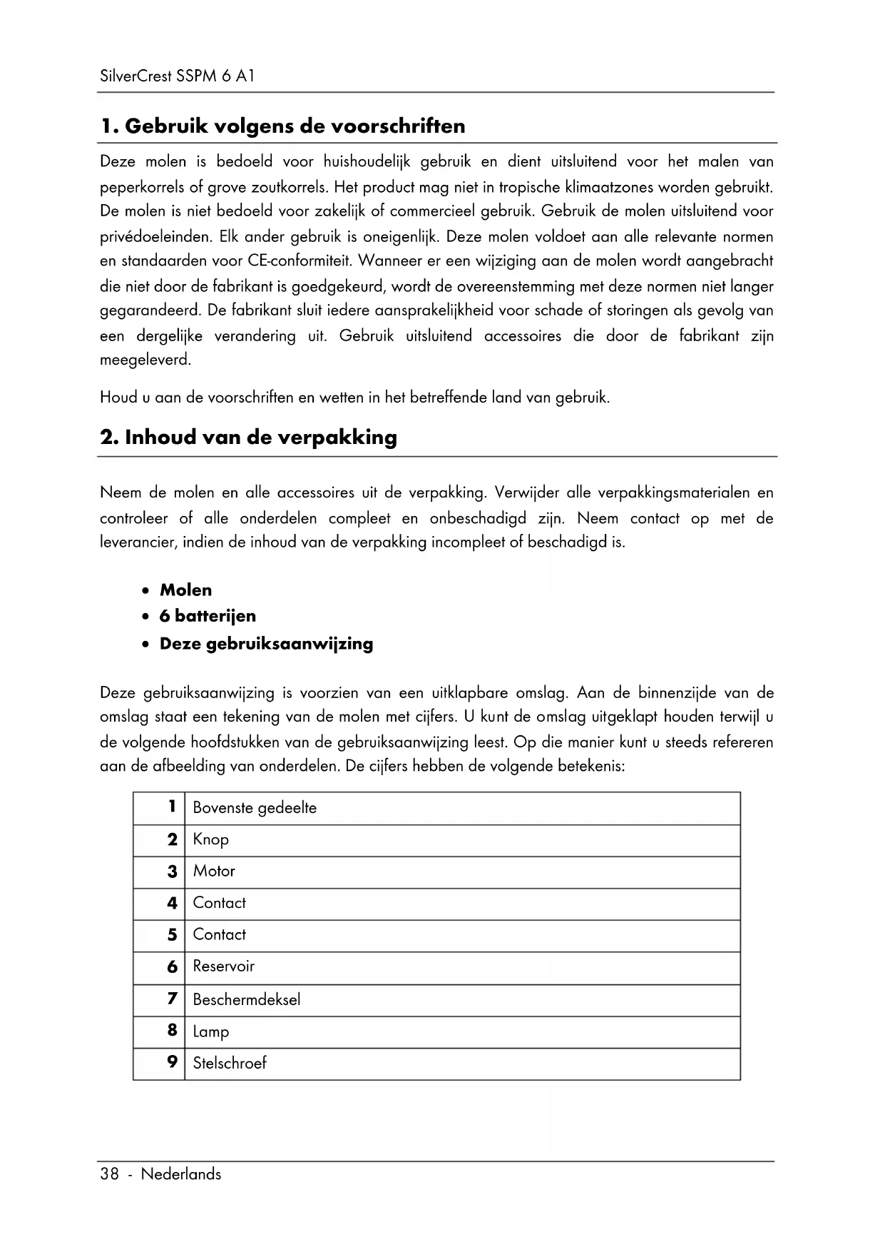 - Reiniging en onderhoud door de gebruiker mag niet door kinderen worden uitgevoerd, tenzij ze 8 jaar of ouder zijn en onder toezicht staan. Houd het apparaat buiten het bereik van kinderen die jonger zijn dan 8 jaar. GEVAAR! Verpakkingsmateriaal is geen kinderspeelgoed. Kinderen mogen niet met de plastic zakken spelen. Er bestaat verstikkingsgevaar! Berg de molen buiten het bereik van kinderen op.SilverCrest SSPM 6 A1 Nederlands - 41 GEVAAR! Batterijen Plaats de batterijen met de juiste polariteit. Let hiervoor op de symbolen in het batterijvak. Probeer batterijen niet opnieuw op te laden en gooi ze nooit in het vuur. Gebruik geen verschillende batterijen (oude en nieuwe, alkaline en koolstof enz.) tegelijkertijd. Verwijder de batterijen als u het apparaat gedurende langere tijd niet gebruikt. Onjuist gebruik kan tot explosiegevaar en lekkende batterijen leiden. Batterijen mogen niet geopend of vervormd worden, omdat in dat geval lekkende chemicaliën persoonlijk letsel kunnen veroorzaken. Verwijder lekkende batterijen onmiddellijk om schade aan de molen te voorkomen. U kunt batterijvloeistof met een droge, absorberende doek verwijderen. Gebruik daarbij geschikte handschoenen! Vermijd contact met de huid. Bij contact met huid en ogen onmiddellijk met veel water spoelen en een arts raadplegen. Bij inslikken van een batterij onmiddellijk de hulp van een arts inroepen.