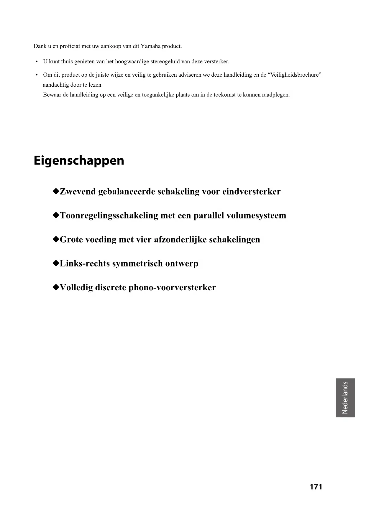 - Om dit product op de juiste wijze en veilig te gebruiken adviseren we deze handleiding en de “Veiligheidsbrochure” aandachtig door te lezen. Bewaar de handleiding op een veilige en toegankelijke plaats om in de toekomst te kunnen raadplegen. Eigenschappen ◆ Zwevend gebalanceerde schakeling voor eindversterker ◆ Toonregelingsschakeling met een parallel volumesysteem ◆ Grote voeding met vier afzonderlijke schakelingen ◆ Links-rechts symmetrisch ontwerp ◆ Volledig discrete phono-voorversterker172 Dingen die u moet weten alvorens het product te gebruiken Over deze handleiding