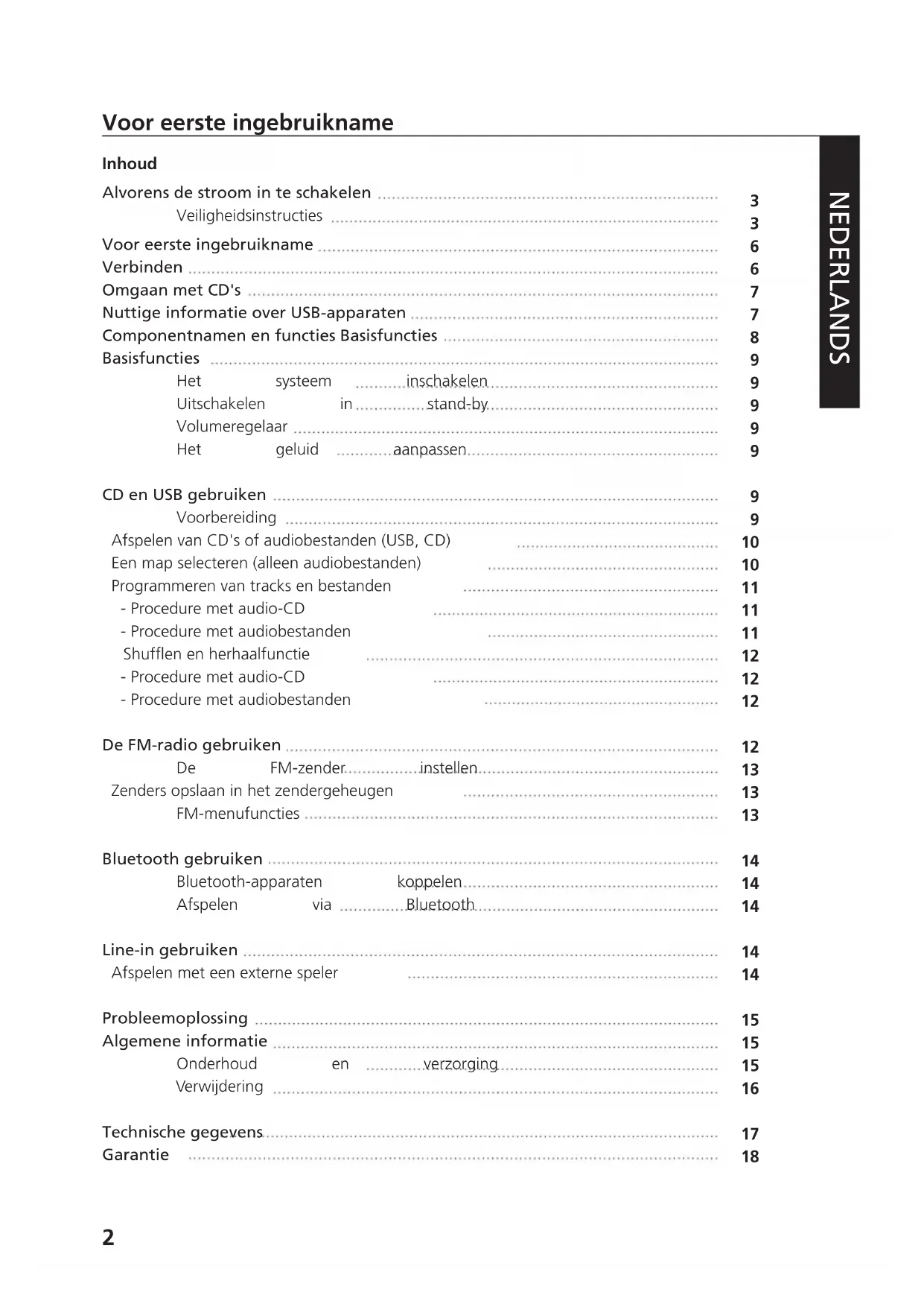 Voor eerste ingebruikname Inhoud Alvorens de stroom in te schakelen Veiligheidsinstructies Voor eerste ingebruikname Verbinden Omgaan met CD's Nuttige informatie over USB-apparaten Componentnamen en functies Basisfuncties Basisfuncties Het systeem inschakelen Uitschakelen in stand-by Volumeregelaar Het geluid aanpassen CD en USB gebruiken Voorbereiding Afspelen van CD's of audiobestanden (USB, CD) Een map selecteren (alleen audiobestanden) Programmeren van tracks en bestanden - Procedure met audio-CD - Procedure met audiobestanden Shufenenherhaalfunctie - Procedure met audio-CD - Procedure met audiobestanden De FM-radio gebruiken De FM-zender instellen Zenders opslaan in het zendergeheugen FM-menufuncties Bluetooth gebruiken Bluetooth-apparaten koppelen Afspelen via Bluetooth Line-in gebruiken Afspelen met een externe speler Probleemoplossing Algemene informatie Onderhoud en verzorging Verwijdering Technische gegevens Garantie