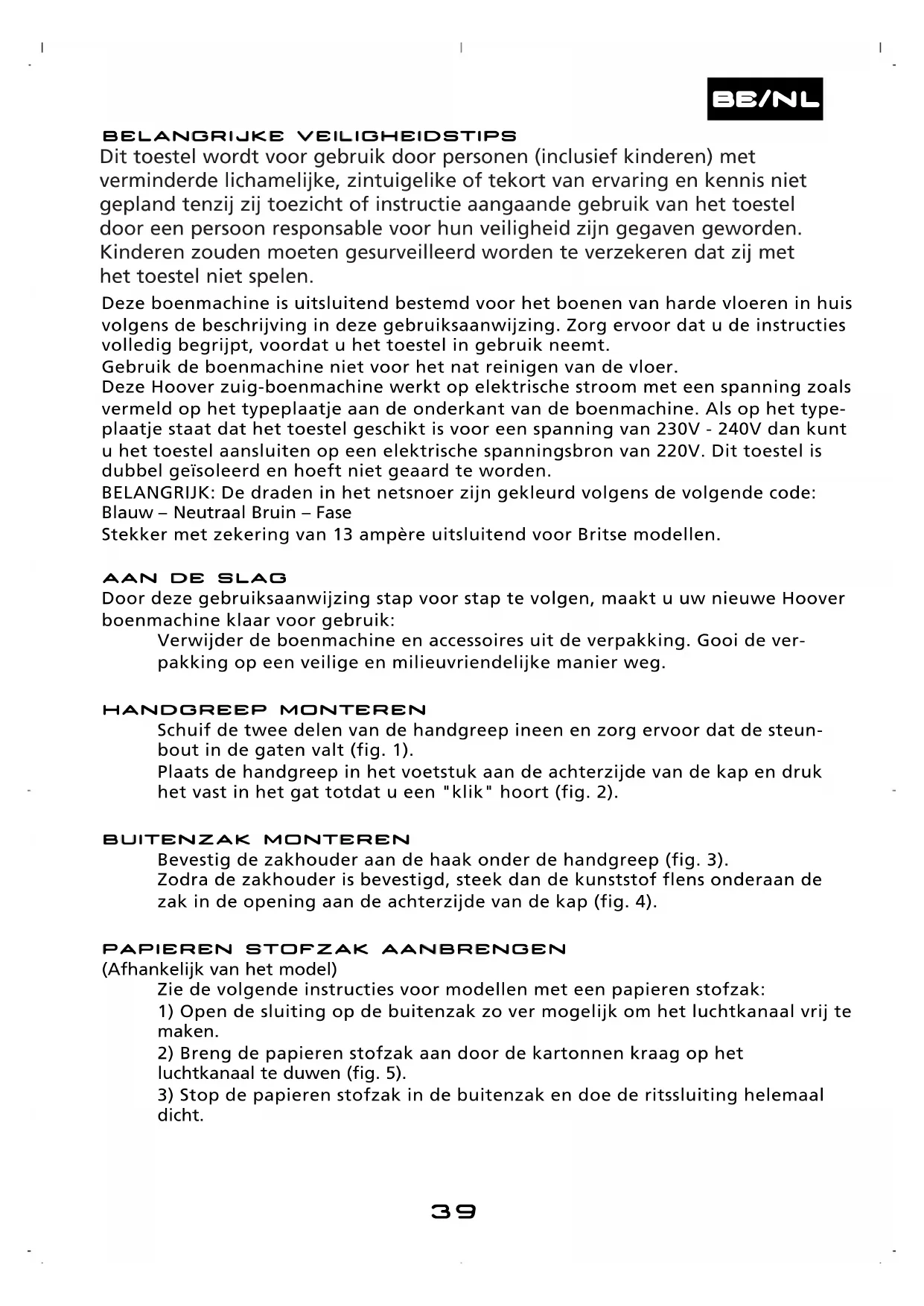 Door deze gebruiksaanwijzing stap voor stap te volgen, maakt u uw nieuwe Hooverboenmachine klaar voor gebruik:Verwijder de boenmachine en accessoires uit de verpakking. Gooi de ver-pakking op een veilige en milieuvriendelijke manier weg. HHAANNDDGGRREEEEPP MMOONNTTEERREENN Schuif de twee delen van de handgreep ineen en zorg ervoor dat de steun-bout in de gaten valt (fig. 1). Plaats de handgreep in het voetstuk aan de achterzijde van de kap en drukhet vast in het gat totdat u een "klik" hoort (fig. 2). BBUUIITTEENNZZAAKK MMOONNTTEERREENN Bevestig de zakhouder aan de haak onder de handgreep (fig. 3). Zodra de zakhouder is bevestigd, steek dan de kunststof flens onderaan dezak in de opening aan de achterzijde van de kap (fig. 4).