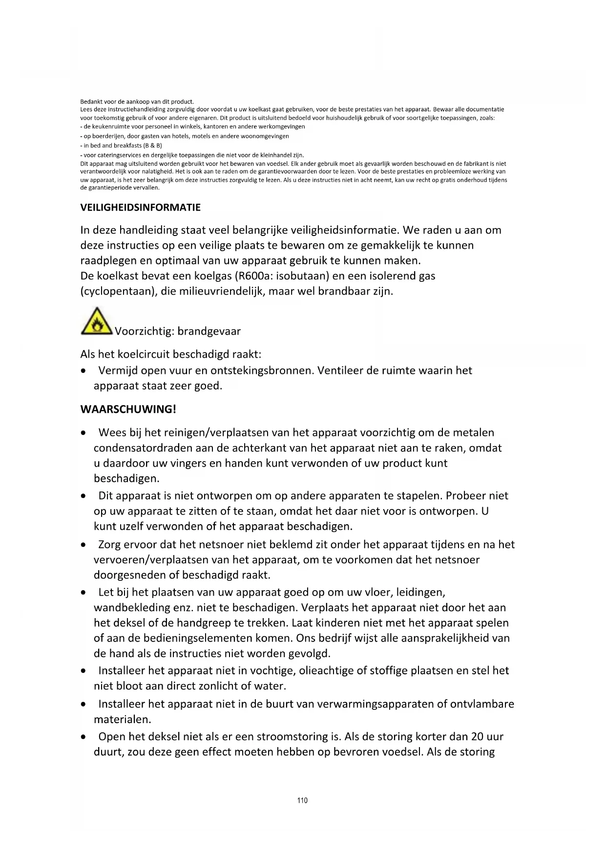 Este aparelho está marcado de acordo com a Directiva europeia 2012/19/CE sobre Resíduos de Equipamento Eléctrico e Electrónico (DEEE). Os DEEE contêm substâncias poluentes (que podem causar consequências negativas para o ambiente) e componentes básicos (que podem ser reutilizados). É importante que os DEEE sejam submetidos a tratamentos específicos, de maneira a remover e eliminar adequadamente todos os poluentes, e recuperar e reciclar todos os materiais. Os indivíduos têm um papel importante ao assegurar que os DEEE não se tornam num problema ambiental, é essencial seguir algumas regras básicas: Os DEEE não devem ser tratados como resíduos domésticos. Os DEEE devem ser entregues nos pontos de recolha relevantes geridos pelo município ou por companhias registadas. Em muitos países, a recolha casa-a-casa, para DEEE de grandes dimensões, pode existir. Em muitos países, ao comprar um novo aparelho, o antigo pode ser devolvido ao comerciante que tem de o recolher sem qualquer custo, um-para-um, desde que o equipamento seja de tipo equivalente e tenha as mesmas funções que o equipamento fornecido. Conformidade Ao colocar a marca neste produto, estamos a confirmar a conformidade com todos os requisitos de segurança, saúde e ambiente relevantes que são aplicáveis na legislação sobre este produto. 109Bedankt voor de aankoop van dit product. Lees deze instructiehandleiding zorgvuldig door voordat u uw koelkast gaat gebruiken, voor de beste prestaties van het apparaat. Bewaar alle documentatie voor toekomstig gebruik of voor andere eigenaren. Dit product is uitsluitend bedoeld voor huishoudelijk gebruik of voor soortgelijke toepassingen, zoals: - de keukenruimte voor personeel in winkels, kantoren en andere werkomgevingen - op boerderijen, door gasten van hotels, motels en andere woonomgevingen - in bed and breakfasts (B & B) - voor cateringservices en dergelijke toepassingen die niet voor de kleinhandel zijn. Dit apparaat mag uitsluitend worden gebruikt voor het bewaren van voedsel. Elk ander gebruik moet als gevaarlijk worden beschouwd en de fabrikant is niet verantwoordelijk voor nalatigheid. Het is ook aan te raden om de garantievoorwaarden door te lezen. Voor de beste prestaties en probleemloze werking van uw apparaat, is het zeer belangrijk om deze instructies zorgvuldig te lezen. Als u deze instructies niet in acht neemt, kan uw recht op gratis onderhoud tijdens de garantieperiode vervallen. VEILIGHEIDSINFORMATIE In deze handleiding staat veel belangrijke veiligheidsinformatie. We raden u aan om deze instructies op een veilige plaats te bewaren om ze gemakkelijk te kunnen raadplegen en optimaal van uw apparaat gebruik te kunnen maken. De koelkast bevat een koelgas (R600a: isobutaan) en een isolerend gas (cyclopentaan), die milieuvriendelijk, maar wel brandbaar zijn. Voorzichtig: brandgevaar Als het koelcircuit beschadigd raakt: