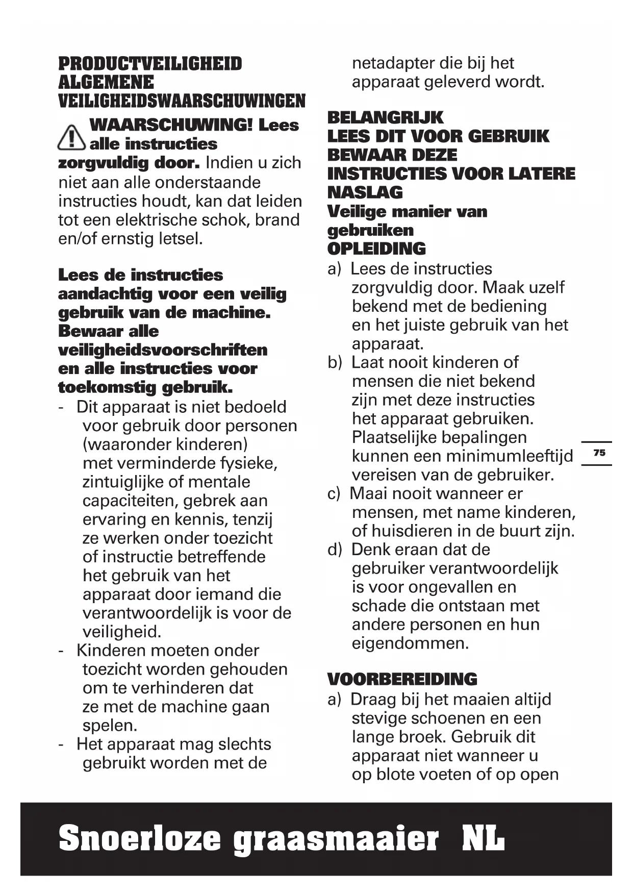 NASLAG Veilige manier van gebruiken OPLEIDING a) Lees de instructies zorgvuldig door. Maak uzelf bekend met de bediening en het juiste gebruik van het apparaat. b) Laat nooit kinderen of mensen die niet bekend zijn met deze instructies het apparaat gebruiken. Plaatselijke bepalingen kunnen een minimumleeftijd vereisen van de gebruiker. c) Maai nooit wanneer er mensen, met name kinderen, of huisdieren in de buurt zijn. d) Denk eraan dat de gebruiker verantwoordelijk is voor ongevallen en schade die ontstaan met andere personen en hun eigendommen. VOORBEREIDING a) Draag bij het maaien altijd stevige schoenen en een lange broek. Gebruik dit apparaat niet wanneer u op blote voeten of op open76 Snoerloze graasmaaier NL sandalen/slippers loopt. b) Inspecteer de omgeving van de gebruikte apparatuur en verwijder alle voorwerpen die door de machine weggeworpen zouden kunnen worden; c) Controleer voor het gebruik altijd of de messen, de bouten waarmee de messen vastzitten en het snijgedeelte niet versleten of beschadigd zijn. Vervang versleten of beschadigde messen en bouten in paren om zo de balans te bewaren. Vervang beschadigde en onleesbare labels. BEDIENING a) Maai alleen overdag of in goed kunstlicht. b) Gebruik het apparaat, voor zover mogelijk, niet in nat gras. c) Zorg er op hellingen altijd voor dat u stevig staat. d) Loop, ren niet; e) Een ronddraaiende machine op wielen gebruikt u evenwijdig aan hellingen, niet op en neer; f) Wees extra voorzichtig wanneer u op hellingen van richting verandert. g) Maai niet op zeer steile hellingen. h) Wees extra voorzichtig wanneer u het apparaat achteruit of naar u toe haalt.