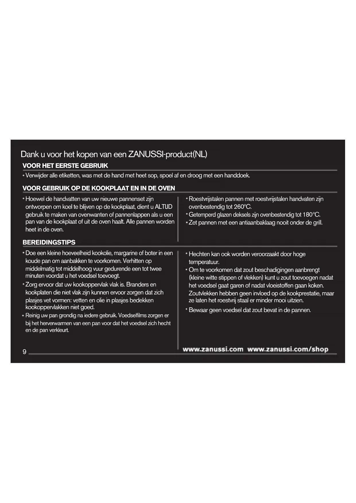 VOOR GEBRUIK OP DE KOOKPLAAT EN IN DE OVEN Verwijder alle etiketten, was met de hand met heet sop, spoel af en droog met een handdoek. Hoewel de handvatten van uw nieuwe pannenset zijn ontworpen om koel te blijven op de kookplaat, dient u ALTIJD gebruik te maken van ovenwanten of pannenlappen als u een pan van de kookplaat of uit de oven haalt. Alle pannen worden heet in de oven. BEREIDINGSTIPS Doe een kleine hoeveelheid kookolie, margarine of boter in een koude pan om aanbakken te voorkomen. Verhitten op middelmatig tot middelhoog vuur gedurende een tot twee minuten voordat u het voedsel toevoegt. Zorg ervoor dat uw kookoppervlak vlak is. Branders en kookplaten die niet vlak zijn kunnen ervoor zorgen dat zich plasjes vet vormen: vetten en olie in plasjes bedekken kookoppervlakken niet goed. Reinig uw pan grondig na iedere gebruik. Voedselfilms zorgen er bij het herverwarmen van een pan voor dat het voedsel zich hecht en de pan verkleurt. Hechten kan ook worden veroorzaakt door hoge temperatuur. Om te voorkomen dat zout beschadigingen aanbrengt (kleine witte stippen of vlekken) kunt u zout toevoegen nadat het voedsel gaat garen of nadat vloeistoffen gaan koken. Zoutvlekken hebben geen invloed op de kookprestatie, maar ze laten het roestvrij staal er minder mooi uitzien. Bewaar geen voedsel dat zout bevat in de pannen. Roestvrijstalen pannen met roestvrijstalen handvaten zijn ovenbestendig tot 260ºC. Getemperd glazen deksels zijn ovenbestendig tot 180 ºC. Zet pannen met een antiaanbaklaag nooit onder de grill.