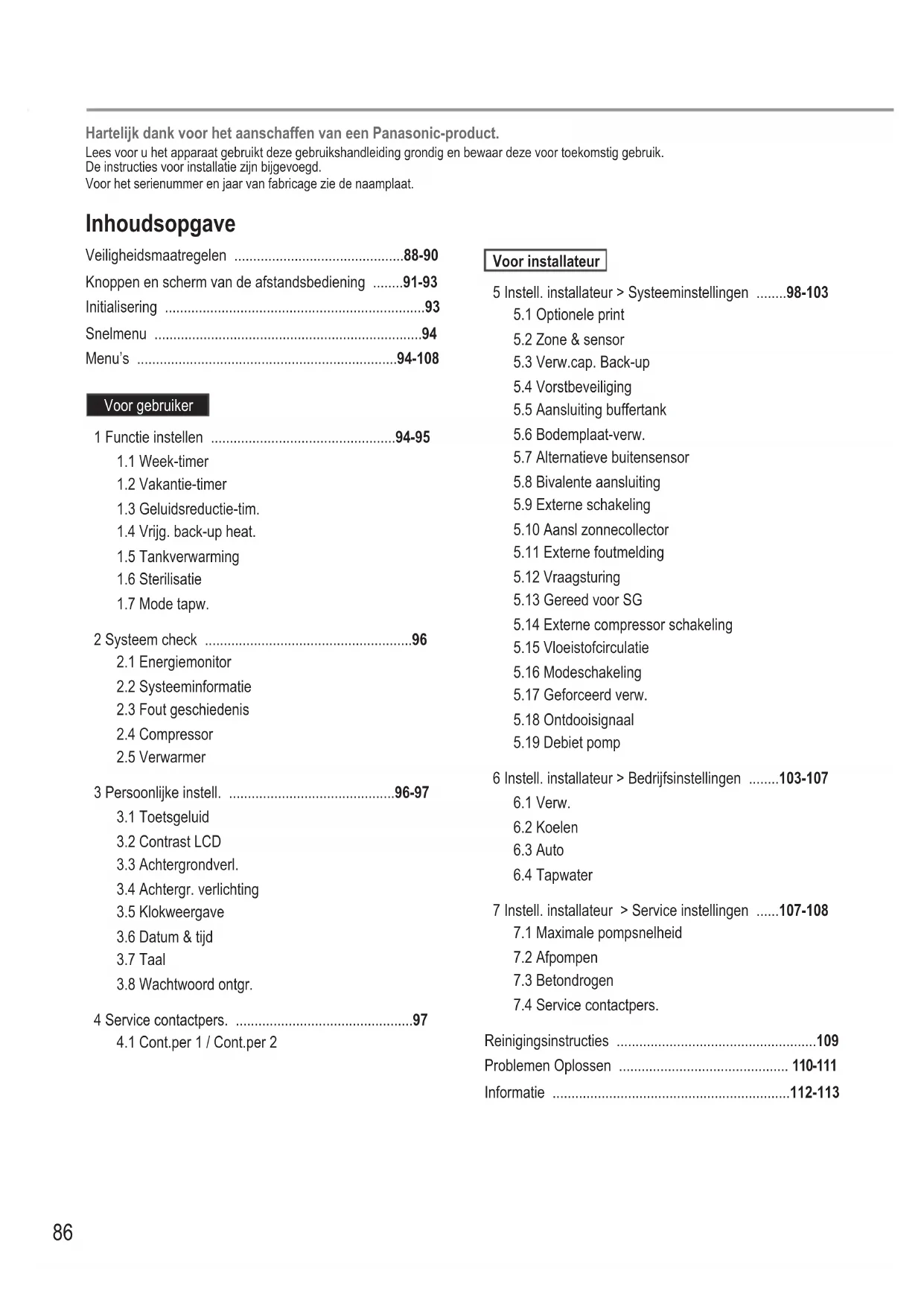 Reinigingsinstructies .....................................................109 Problemen Oplossen ............................................. 110-111 Informatie ...............................................................112-113 Hartelijk dank voor het aanschaffen van een Panasonic-product. Lees voor u het apparaat gebruikt deze gebruikshandleiding grondig en bewaar deze voor toekomstig gebruik. De instructies voor installatie zijn bijgevoegd. Voor het serienummer en jaar van fabricage zie de naamplaat.87