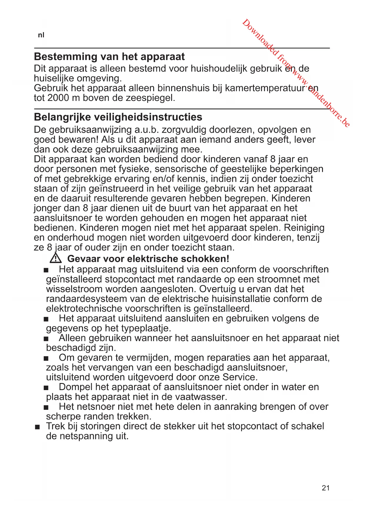 Bestemming van het apparaat Dit apparaat is alleen bestemd voor huishoudelijk gebruik en de huiselijke omgeving. Gebruik het apparaat alleen binnenshuis bij kamertemperatuur en tot 2000 m boven de zeespiegel. Belangrijke veiligheidsinstructies De gebruiksaanwijzing a.u.b. zorgvuldig doorlezen, opvolgen en goed bewaren! Als u dit apparaat aan iemand anders geeft, lever dan ook deze gebruiksaanwijzing mee. Dit apparaat kan worden bediend door kinderen vanaf 8 jaar en door personen met fysieke, sensorische of geestelijke beperkingen of met gebrekkige ervaring en/of kennis, indien zij onder toezicht staan of zijn geïnstrueerd in het veilige gebruik van het apparaat en de daaruit resulterende gevaren hebben begrepen. Kinderen jonger dan 8 jaar dienen uit de buurt van het apparaat en het aansluitsnoer te worden gehouden en mogen het apparaat niet bedienen. Kinderen mogen niet met het apparaat spelen. Reiniging en onderhoud mogen niet worden uitgevoerd door kinderen, tenzij ze 8 jaar of ouder zijn en onder toezicht staan. W Gevaar voor elektrische schokken! ■ Het apparaat mag uitsluitend via een conform de voorschriften geïnstalleerd stopcontact met randaarde op een stroomnet met wisselstroom worden aangesloten. Overtuig u ervan dat het randaardesysteem van de elektrische huisinstallatie conform de elektrotechnische voorschriften is geïnstalleerd. ■ Het apparaat uitsluitend aansluiten en gebruiken volgens de gegevens op het typeplaatje. ■ Alleen gebruiken wanneer het aansluitsnoer en het apparaat niet beschadigd zijn. ■ Om gevaren te vermijden, mogen reparaties aan het apparaat, zoals het vervangen van een beschadigd aansluitsnoer, uitsluitend worden uitgevoerd door onze Service. ■ Dompel het apparaat of aansluitsnoer niet onder in water en plaats het apparaat niet in de vaatwasser. ■ Het netsnoer niet met hete delen in aanraking brengen of over scherpe randen trekken. ■ Trek bij storingen direct de stekker uit het stopcontact of schakel de netspanning uit. Downloaded from www.vandenborre.be22
