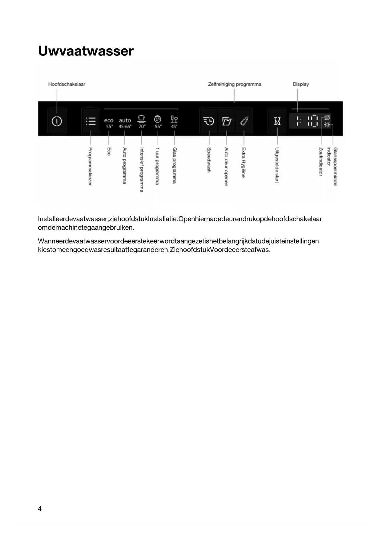Programmatijd 90 minuten. 14Glas programma Een delicaat vaatwasprogramma met een lage temperatuur voor het wassen van tere voorwerpen van kristal/glas. Denk eraan om weinig vaatwasmiddel te gebruiken en de voorwerpen zo te plaatsen dat ze elkaar tijdens het wassen niet kunnen raken. Zie ook Breekbare vaat in het hoofdstuk Inruimen van de vaatwasser. Porselein dat net is gebruikt en geen opgedroogde resten heeft kan ook met dit programma gewassen worden. Zelfreiniging programma Zelfreinigingsprogramma voor het hygiënisch reinigen van de kuip van de vaatwasser, de sproeiarmen en de spoelpijpen. Dit programma moet draaien (zonder vaat in de machine) met normaal vaatwasmiddel of citroenzuur. Er zijn ook speciale vaatwasserreinigers te koop. Voor het verwijderen van kalkafzetting, kijk Kuip van de vaatwasser in het hoofdstuk Onderhoud en reiniging. Houd de optietoetsen voor Zelfreiniging programma ingedrukt om het programma te activeren. Zelfreiniging programma start wanneer de deur wordt gesloten. Zelfreiniging programma (CLn) - Kies optie Druk, om een optie te selecteren, op een van de optietoetsen totdat de optie geactiveerd is. De beschikbare opties verschillen per programma en sommige opties kunnen niet gecombineerd worden (beschikbare opties branden gedimd). Speedwash Deze optie verkort de programmaduur, maar gebruikt meer energie en water. Auto deur openen