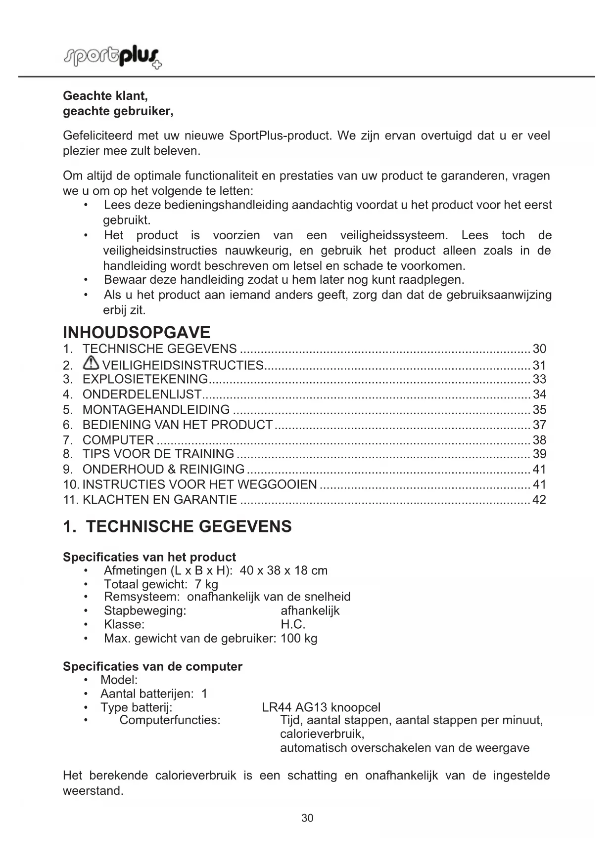 - Max. gewicht van de gebruiker: 100 kg Het berekende calorieverbruik is een schatting en onafhankelijk van de ingestelde weerstand. Geachte klant, geachte gebruiker, Gefeliciteerd met uw nieuwe SportPlus-product. We zijn ervan overtuigd dat u er veel plezier mee zult beleven. Om altijd de optimale functionaliteit en prestaties van uw product te garanderen, vragen we u om op het volgende te letten: