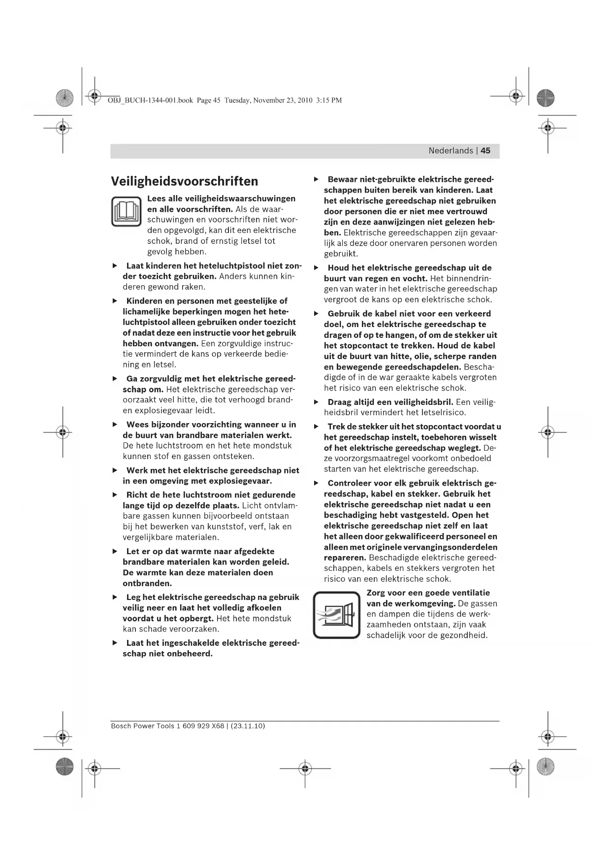 Veiligheidsvoorschriften Lees alle veiligheidswaarschuwingen en alle voorschriften. Als de waar- schuwingen en voorschriften niet wor- den opgevolgd, kan dit een elektrische schok, brand of ernstig letsel tot gevolg hebben. f Laat kinderen het heteluchtpistool niet zon- der toezicht gebruiken. Anders kunnen kin- deren gewond raken. f Kinderen en personen met geestelijke of lichamelijke beperkingen mogen het hete- luchtpistool alleen gebruiken onder toezicht of nadat deze een instructie voor het gebruik hebben ontvangen. Een zorgvuldige instruc- tie vermindert de kans op verkeerde bedie- ning en letsel. f Ga zorgvuldig met het elektrische gereed- schap om. Het elektrische gereedschap ver- oorzaakt veel hitte, die tot verhoogd brand- en explosiegevaar leidt. f Wees bijzonder voorzichting wanneer u in de buurt van brandbare materialen werkt. De hete luchtstroom en het hete mondstuk kunnen stof en gassen ontsteken. f Werk met het elektrische gereedschap niet in een omgeving met explosiegevaar. f Richt de hete luchtstroom niet gedurende lange tijd op dezelfde plaats. Licht ontvlam- bare gassen kunnen bijvoorbeeld ontstaan bij het bewerken van kunststof, verf, lak en vergelijkbare materialen. f Let er op dat warmte naar afgedekte brandbare materialen kan worden geleid. De warmte kan deze materialen doen ontbranden. f Leg het elektrische gereedschap na gebruik veilig neer en laat het volledig afkoelen voordat u het opbergt. Het hete mondstuk kan schade veroorzaken. f Laat het ingeschakelde elektrische gereed- schap niet onbeheerd. f Bewaar niet-gebruikte elektrische gereed- schappen buiten bereik van kinderen. Laat het elektrische gereedschap niet gebruiken door personen die er niet mee vertrouwd zijn en deze aanwijzingen niet gelezen heb- ben. Elektrische gereedschappen zijn gevaar- lijk als deze door onervaren personen worden gebruikt. f Houd het elektrische gereedschap uit de buurt van regen en vocht. Het binnendrin- gen van water in het elektrische gereedschap vergroot de kans op een elektrische schok. f Gebruik de kabel niet voor een verkeerd doel, om het elektrische gereedschap te dragen of op te hangen, of om de stekker uit het stopcontact te trekken. Houd de kabel uit de buurt van hitte, olie, scherpe randen en bewegende gereedschapdelen. Bescha- digde of in de war geraakte kabels vergroten het risico van een elektrische schok. f Draag altijd een veiligheidsbril. Een veilig- heidsbril vermindert het letselrisico. f Trek de stekker uit het stopcontact voordat u het gereedschap instelt, toebehoren wisselt of het elektrische gereedschap weglegt. De- ze voorzorgsmaatregel voorkomt onbedoeld starten van het elektrische gereedschap. f Controleer voor elk gebruik elektrisch ge- reedschap, kabel en stekker. Gebruik het elektrische gereedschap niet nadat u een beschadiging hebt vastgesteld. Open het elektrische gereedschap niet zelf en laat het alleen door gekwalificeerd personeel en alleen met originele vervangingsonderdelen repareren. Beschadigde elektrische gereed- schappen, kabels en stekkers vergroten het risico van een elektrische schok. Zorg voor een goede ventilatie van de werkomgeving. De gassen en dampen die tijdens de werk- zaamheden ontstaan, zijn vaak schadelijk voor de gezondheid. OBJ_BUCH-1344-001.book Page 45 Tuesday, November 23, 2010 3:15 PM46 | Nederlands 1 609 929 X68 | (23.11.10) Bosch Power Tools f Draag werkhandschoenen en raak het hete mondstuk niet aan. Er bestaat verbrandings- gevaar. f Richt de hete luchtstroom nooit op perso- nen of dieren. f Gebruik het elektrische gereedschap niet als haardroger. De naar buiten komende luchtstroom is veel heter dan die van een haardroger. f Als het gebruik van het elektrische gereed- schap in een vochtige omgeving onvermij- delijk is, dient u een aardlekschakelaar te gebruiken. Het gebruik van een aardlekscha- kelaar vermindert het risico van een elektri- sche schok. f Gebruik het elektrische gereedschap niet met een beschadigde kabel. Raak de be- schadigde kabel niet aan en trek de stekker uit het stopcontact als de kabel tijdens de werkzaamheden wordt beschadigd. Bescha- digde kabels vergroten het risico van een elektrische schok. Functiebeschrijving Vouw de uitvouwbare pagina met de afbeelding van het gereedschap open en laat deze pagina opengevouwen terwijl u de gebruiksaanwijzing leest. Gebruik volgens bestemming Het elektrische gereedschap is bestemd voor het vervormen en lassen van kunststof, verwij- deren van verflagen en verwarmen van krimp- kousen. Het is ook geschikt voor het solderen en vertinnen, losmaken van lijmverbindingen en ontdooien van waterleidingen. Afgebeelde componenten De componenten zijn genummerd zoals op de afbeelding van het elektrische gereedschap op de pagina met afbeeldingen. 1 Mondstuk 2 Warmte-isolatie 3 Steunvlak 4 Aan/uit-schakelaar met regelaar luchthoe- veelheid en temperatuur (GHG 500-2/GHG 600-3) 5 Aan/uit-schakelaar met luchtvolumeregelaar (GHG 630 DCE) 6 Toets voor temperatuurregeling (GHG 630 DCE) 7 Display (GHG 630 DCE) 8 Plat mondstuk* 9 Sponningmondstuk* 10 Reflectormondstuk* 11 Lasdraad* 12 Lasschoen* 13 Reduceermondstuk* 14 Krimpkous* 15 Haaks mondstuk*
