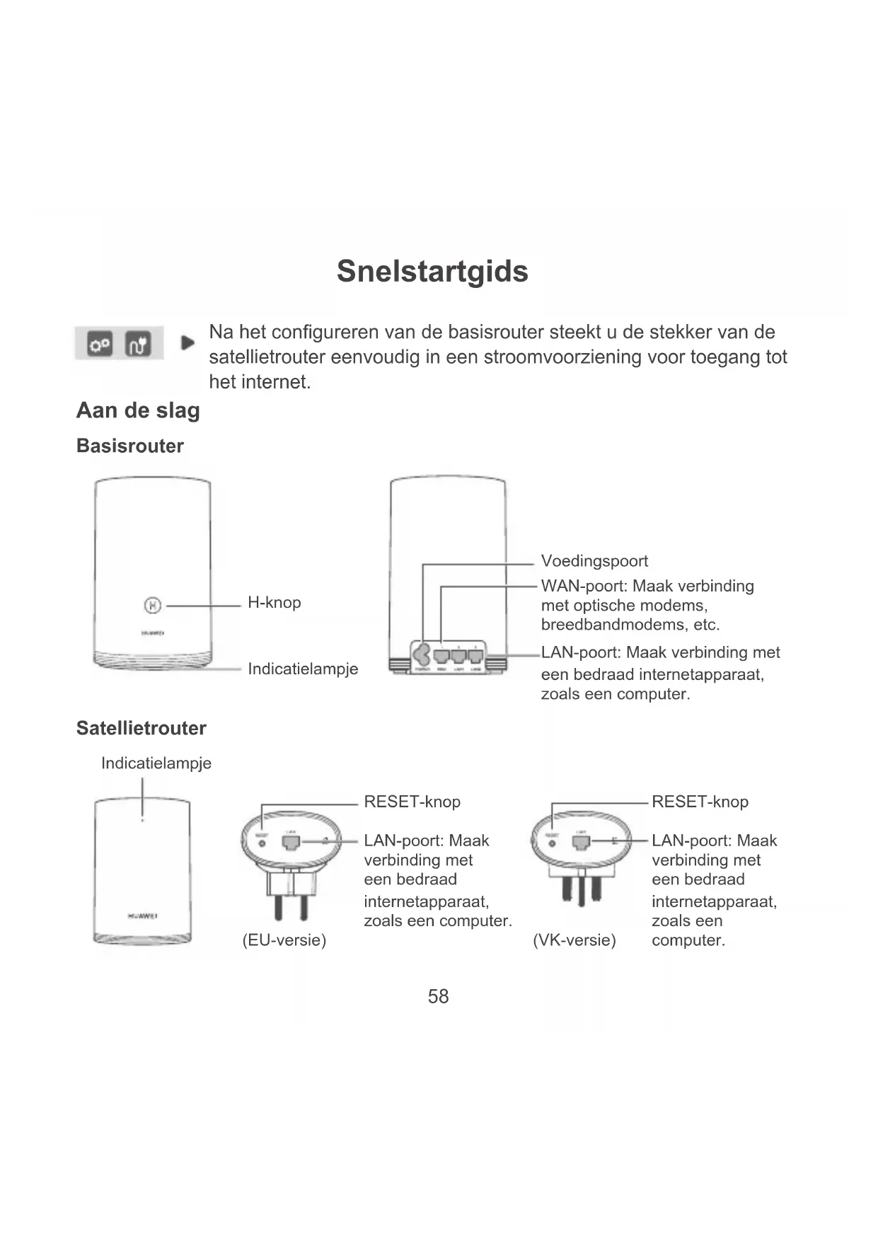 - Raak het apparaat of de voedingsadapter niet aan met natte handen. Dat kan leiden tot kortsluiting, storingen of elektrische schokken. Informatie over verwijdering en recycling Het symbool van de prullenbak met het kruis erdoorheen op uw product, batterij, documentatie of verpakking herinnert u eraan dat alle elektronische producten en batterijen aan het einde van heen levensduur dienen te worden ingeleverd bij speciale afvalinzamelingspunten; deze mogen niet samen met normaal huishoudelijk afval worden weggegooid. Het is de verantwoordelijkheid van de gebruiker om de apparatuur in te leveren bij een daartoe aangewezen inzamelingspunt of -dienst voor afzonderlijke recycling van elektrische en elektronische apparatuur en batterijen, in overeenstemming met de plaatselijke wetgeving. Een juiste inzameling en recycling van uw apparatuur helpt ervoor te zorgen dat afval van elektrische en elektronische apparatuur wordt gerecycled op een manier waarbij waardevolle materialen worden teruggewonnen en beschermt de gezondheid van personen en hun omgeving. Een onjuiste hantering, onbedoeld stukgaan, schade en/of een onjuiste recycling aan het einde van de levensduur kan schadelijk zijn voor de gezondheid en het milieu. Voor meer informatie over waar en hoe u afval van elektrische en elektronische apparatuur kunt inleveren, neemt u contact op met de plaatselijke autoriteiten, uw verkoper of de afvalinzamelingsdienst, of u bezoekt de website http://consumer.huawei.com/en/. Beperking van gevaarlijke stoffen Dit apparaat en alle elektrische accessoires voldoen aan de plaatselijke geldende voorschriften met betrekking tot de beperking van het gebruik van bepaalde gevaarlijke stoffen in elektrische en elektronische apparatuur, zoals EU REACH, RoHS evenals voorschriften met betrekking tot batterijen (indien inbegrepen), etc. Voor verklaringen van conformiteit met betrekking tot REACH en RoHS bezoekt u onze website http://consumer.huawei.com/certication.71 Naleving van de EU-wetgeving Verklaring Hierbij verklaart Huawei Technologies Co., Ltd. dat de apparaten WS5280 V2 en PT8020 V2 in overeenstemming zijn met de essentiële vereisten en andere relevante bepalingen van Richtlijn 2014/53/EU. De meest recente, geldige versie van de Verklaring van overeenstemming kan worden bekeken op http://consumer.huawei.com/certication. Dit apparaat mag in alle lidstaten van de EU worden gebruikt. U moet zich houden aan de plaatselijke voorschriften waar het apparaat wordt gebruikt. Dit apparaat kan beperkt zijn in het gebruik, afhankelijk van het lokale netwerk. Beperkingen op de 2,4 GHz-band: Noorwegen: Dit hoofdstuk is niet van toepassing op het geograsche gebied binnen een straal van 20 km van het centrum van Ny-Ålesund. Beperkingen op de 5 GHz-band: In overeenstemming met artikel 10 (10) van richtlijn 2014/53/EU is deze radioapparatuur onderhevig aan beperkingen wanneer zij wordt verkocht in België (BE), Bulgarije (BG), Tsjechië (CZ), Denemarken (DK), Duitsland (DE), Estland (EE), Ierland (IE), Griekenland (EL), Spanje (ES), Frankrijk (FR), Kroatië (HR), Italië (IT), Cyprus (CY), Letland (LV) Litouwen (LT), Luxemburg (LU), Hongarije (HU), Malta (MT), Nederland (NL), Oostenrijk (AT), Polen (PL), Portugal (PT), Roemenië (RO), Slovenië (SI), Slowakije (SK), Finland (FI), Zweden (SE), het Verenigd Koninkrijk (UK), Turkije (TR), Noorwegen (NO), Zwitserland (CH), IJsland (IS), en Liechtenstein (LI). De WLAN-functie van dit apparaat is beperkt tot gebruik binnenshuis bij werking binnen het frequentiebereik 5150 tot 5350 MHz. Frequentieband en vermogen (a) Frequentieband waarbinnen de radioapparatuur functioneert: Sommige frequentiebanden zijn niet in alle landen en regio's beschikbaar. Neem contact op met uw aanbieder voor meer informatie. (b) Maximaal radiofrequentievermogen uitgezonden in de frequentieband waarbinnen de radioapparatuur functioneert: Het maximale vermogen voor alle frequentieband is minder dan de limietwaarde voor de van toepassing zijnde geharmoniseerde standaard. De nominale limieten van de frequentiebanden en het zendvermogen (uitgestraald en/of geleid) van deze radioapparatuur zijn als volgt: Wi-Fi 2.4G: 20 dBm, Wi-Fi 5G: 5150-5350 MHz: 23 dBm, 5470-5725 MHz: 30dBm. Software-informatie De productsoftwareversies zijn 9.0.3.8 (WS5280 V2) en 9.0.3.8 (PT8020 V2). De fabrikant werkt72 de software bij om fouten in de software te verhelpen of de functionaliteit van het product te verbeteren nadat het product is uitgekomen. Alle versies van de software zijn door de fabrikant gecontroleerd, en voldoen aan alle van toepassing zijnde regels. De RF-parameters (bijvoorbeeld frequentiebereik en zendvermogen) zijn niet toegankelijk voor de gebruiker, en kunnen niet worden gewijzigd door de gebruiker. Ga voor de meest recente informatie over accessoires en software naar de Verklaring van overeenstemming op http://consumer.huawei.com/certication. ErP Productinformatie Huawei Technologies Co., Ltd. verklaart hierbij dat zijn producten voldoen aan de Richtlijn Energiegerelateerde Producten (ErP) 2009/125/EG. Raadpleeg voor gedetailleerde informatie over ErP en de gebruikershandleidingen die worden vereist door de Verordening: http://consumer.huawei.com/en/certication. Bezoek http://consumer.huawei.com/en/support/hotline voor het actuele nummer en e-mailadres van de hotline in uw land.73 Guia de início rápido Após congurar o router base, ligue simplesmente o router satélite a uma fonte de alimentação para aceder à Internet. Botão H Porta de alimentação Botão de reposição (Versão para a UE) Porta LAN: permite ligar a um dispositivo de Internet com os, como um computador. Porta WAN: permite ligar a modems de bra ótica, modems de banda larga, etc. Porta LAN: permite ligar a um dispositivo de Internet com os, como um computador. Indicador Indicador Introdução Router base Router satélite (Versão para o RU) Botão de reposição Porta LAN: permite ligar a um dispositivo de Internet com os, como um com