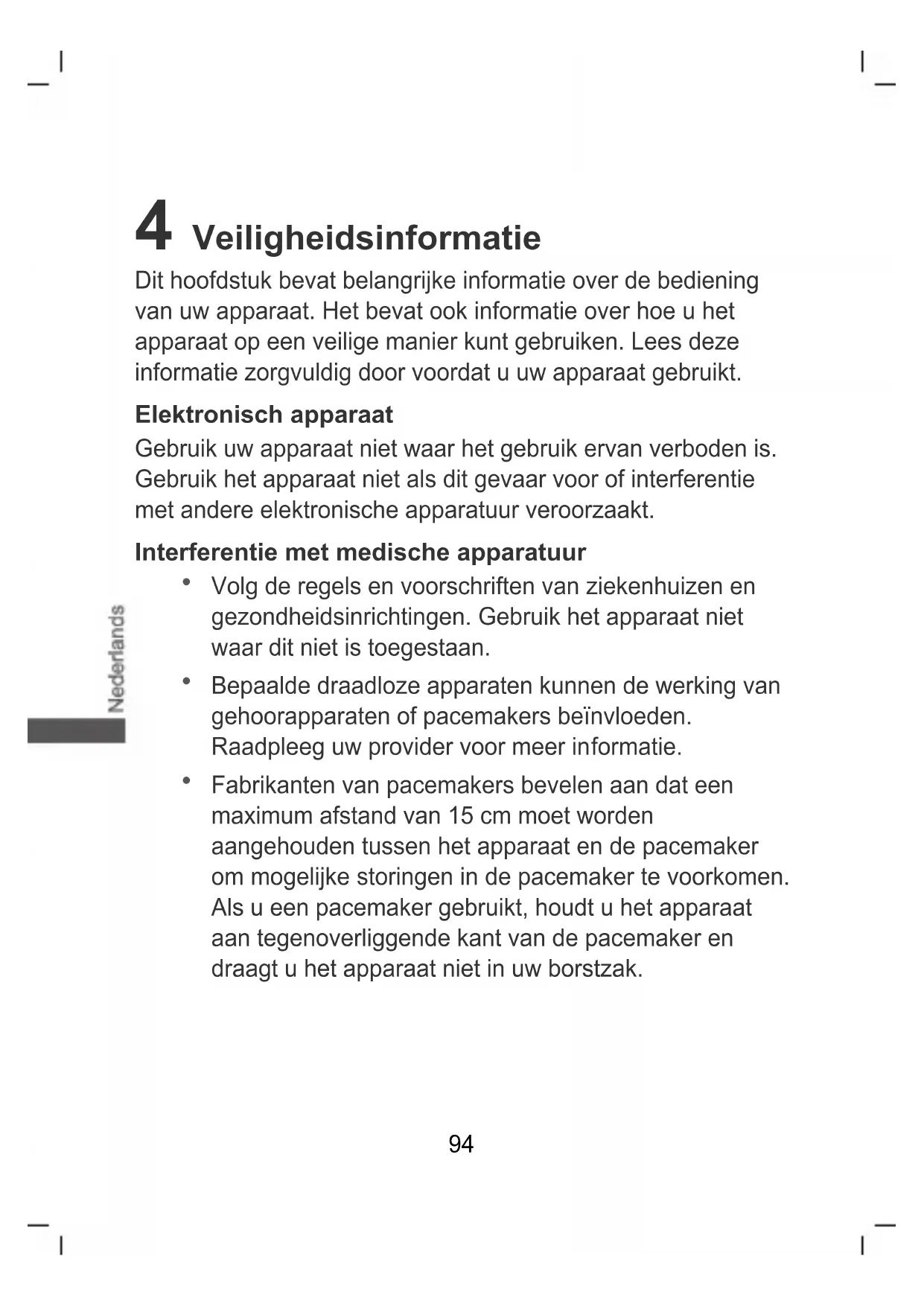 Fabrikanten van pacemakers bevelen aan dat een maximum afstand van 15 cm moet worden aangehouden tussen het apparaat en de pacemaker om mogelijke storingen in de pacemaker te voorkomen. Als u een pacemaker gebruikt, houdt u het apparaat aan tegenoverliggende kant van de pacemaker en draagt u het apparaat niet in uw borstzak.95 Bescherming van uw gehoor tijdens het gebruik van een hoofdtelefoon
