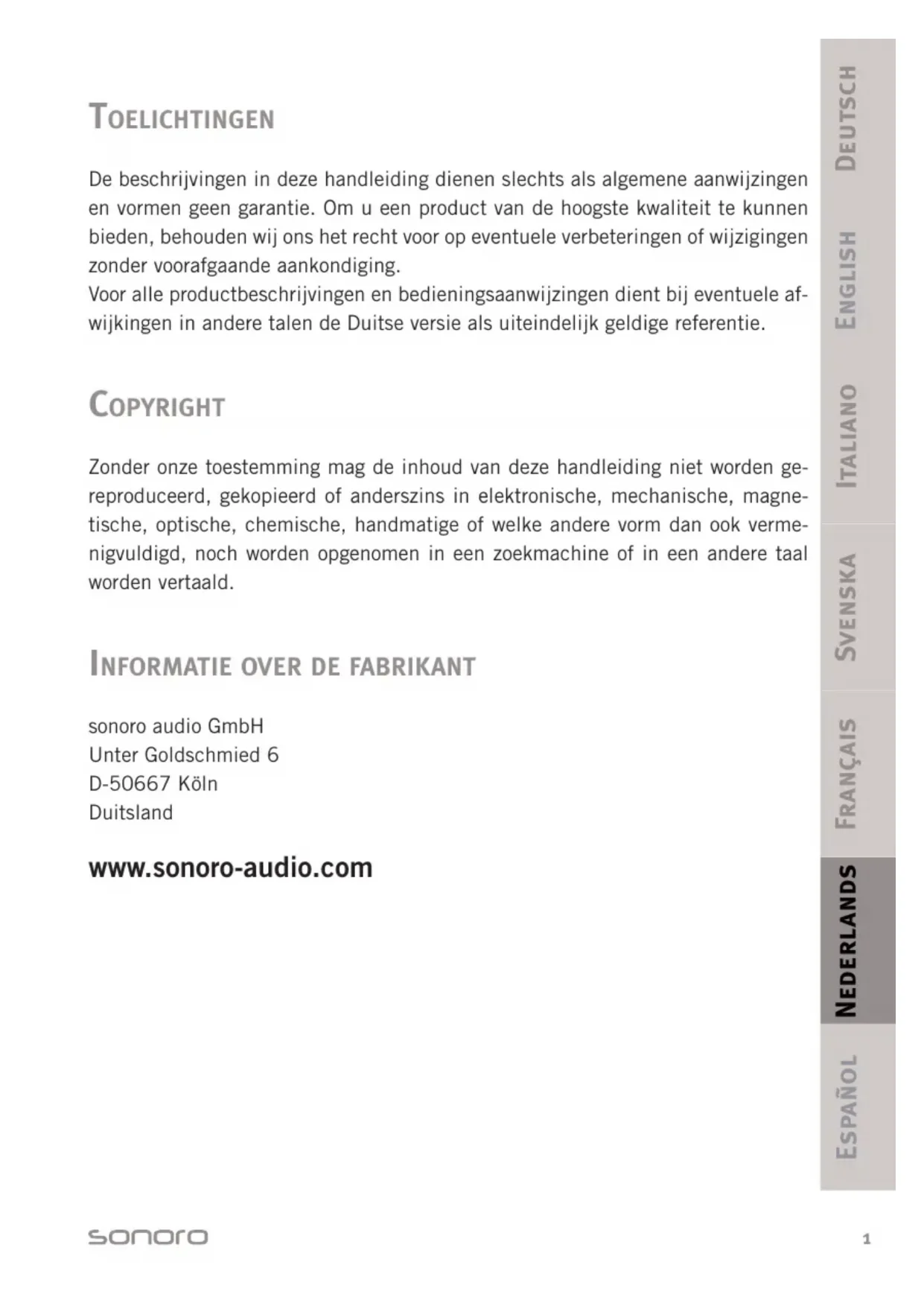 Download de handleiding voor uw Hifi-systeem in PDF-formaat gratis! Vind uw handleiding Elements - SONORO en neem uw elektronisch apparaat weer in handen. Op deze pagina staan alle documenten die nodig zijn voor het gebruik van uw apparaat. Elements van het merk SONORO.