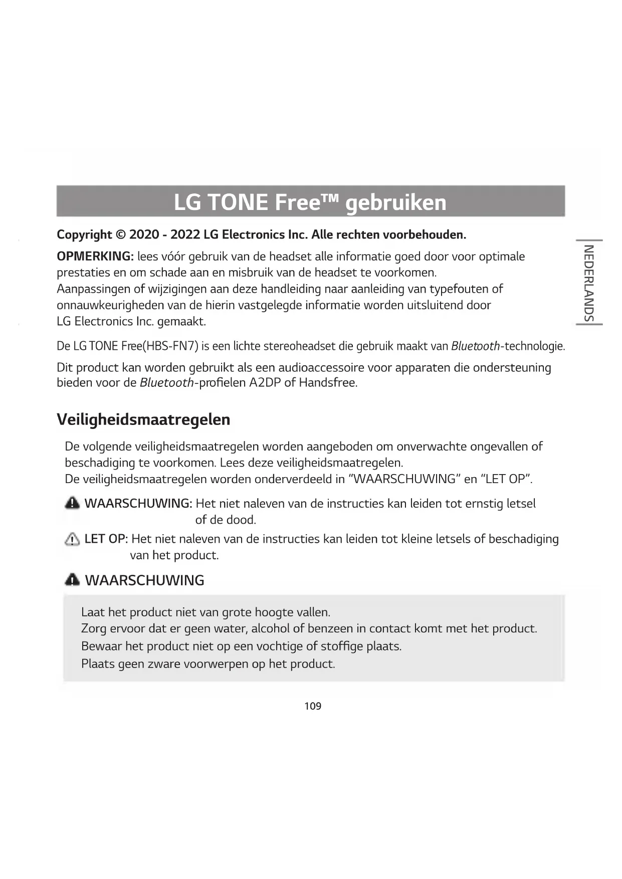 Copyright © 2020 - 2022 LG Electronics Inc. Alle rechten voorbehouden. OPMERKING: lees vóór gebruik van de headset alle informatie goed door voor optimale prestaties en om schade aan en misbruik van de headset te voorkomen. Aanpassingen of wijzigingen aan deze handleiding naar aanleiding van typefouten of onnauwkeurigheden van de hierin vastgelegde informatie worden uitsluitend door LG Electronics Inc. gemaakt. De LG TONE Free(HBS-FN7) is een lichte stereoheadset die gebruik maakt van Bluetooth-technologie. Dit product kan worden gebruikt als een audioaccessoire voor apparaten die ondersteuning bieden voor de Bluetooth-proelen A2DP of Handsfree. Veiligheidsmaatregelen De volgende veiligheidsmaatregelen worden aangeboden om onverwachte ongevallen of beschadiging te voorkomen. Lees deze veiligheidsmaatregelen. De veiligheidsmaatregelen worden onderverdeeld in “WAARSCHUWING” en “LET OP”.