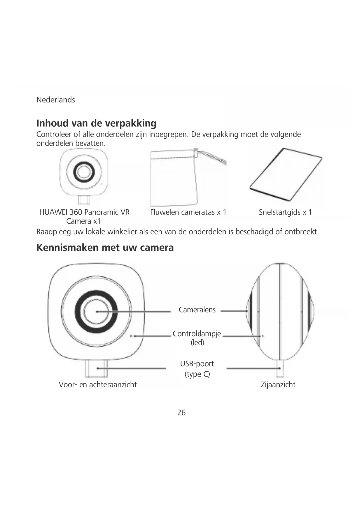 HUAWEI 360 Panoramic VR Camera x1 Fluwelen cameratas x 1 Snelstartgids x 1 Raadpleeg uw lokale winkelier als een van de onderdelen is beschadigd of ontbreekt. Kennismaken met uw camera