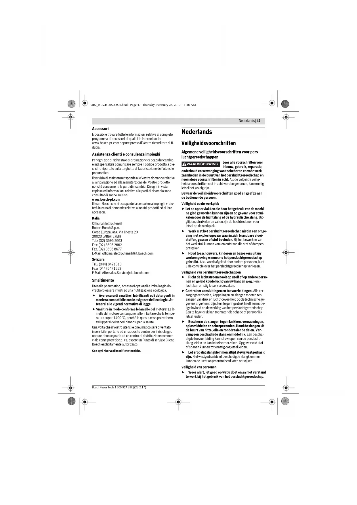 OBJ_BUCH-2092-002.book Page 46 Thursday, February 23, 2017 11:46 AMNederlands | 47 Bosch Power Tools 1 609 92A 33X | (23.2.17) Accessori È possibile trovare tutte le informazioni relative al completo programma di accessori di qualità in internet sotto www.bosch-pt.com oppure presso il Vostro rivenditore di fi- ducia. Assistenza clienti e consulenza impieghi Per ogni tipo di richiesta o di ordinazione di pezzi di ricambio, è indispensabile comunicare sempre il codice prodotto a die- ci cifre riportato sulla targhetta di fabbricazione dell’utensile pneumatico. Il servizio di assistenza risponde alle Vostre domande relative alla riparazione ed alla manutenzione del Vostro prodotto nonché concernenti le parti di ricambio. Disegni in vista esplosa ed informazioni relative alle parti di ricambio sono consultabili anche sul sito: www.bosch-pt.com Il team Bosch che si occupa della consulenza impieghi vi aiu- terà in caso di domande relative ai nostri prodotti ed ai loro accessori. Italia Officina Elettroutensili Robert Bosch S.p.A. Corso Europa, ang. Via Trieste 20 20020 LAINATE (MI) Tel.: (02) 3696 2663 Fax: (02) 3696 2662 Fax: (02) 3696 8677 E-Mail: officina.elettroutensili@it.bosch.com Svizzera Tel.: (044) 8471513 Fax: (044) 8471553 E-Mail: Aftersales.Service@de.bosch.com Smaltimento Utensile pneumatico, accessori opzionali e imballaggio do- vrebbero essere inviati ad una riutilizzazione ecologica. Avere cura di smaltire i lubrificanti ed i detergenti in maniera compatibile con le esigenze dell’ecologia. At- tenersi alle vigenti normative di legge. Smaltire in modo conforme le lamelle del motore! Le la- melle del motore contengono teflon. Evitare che la tempe- ratura superi i 400 °C, perché in questo caso potrebbero svilupparsi dei vapori dannosi per la salute. Una volta che il Vostro utensile pneumatico sarà diventato inservibile, portarlo ad un apposito centro per il riciclaggio oppure riconsegnarlo ad un centro di distribuzione commer- ciale come potrebbe p. es. essere un Punto di servizio Clienti Bosch esplicitamente autorizzato. Con ogni riserva di modifiche tecniche. Nederlands Veiligheidsvoorschriften Algemene veiligheidsvoorschriften voor pers- luchtgereedschappen Lees alle voorschriften vóór inbouw, gebruik, reparatie, onderhoud en vervanging van toebehoren en vóór werk- zaamheden in de buurt van het persluchtgereedschap en neem deze voorschriften in acht. Als de volgende veilig- heidsvoorschriften niet in acht worden genomen, kan ernstig letsel het gevolg zijn. Bewaar de veiligheidsvoorschriften goed en geef ze aan de bedienende persoon. Veiligheid op de werkplek Let op oppervlakken die door het gebruik van de machi- ne glad geworden kunnen zijn en op gevaar voor strui- kelen door de luchtslang of de hydraulische slang. Uit- glijden, struikelen en vallen zijn de hoofdredenen voor letsel op de werkplek. Werk met het persluchtgereedschap niet in een omge- ving met explosiegevaar waarin zich brandbare vloei- stoffen, gassen of stof bevinden. Bij het bewerken van het werkstuk kunnen vonken ontstaan die stof of dampen ontsteken. Houd toeschouwers, kinderen en bezoekers uit uw werkomgeving wanneer u het persluchtgereedschap gebruikt. Als u wordt afgeleid door andere personen, kunt u de controle over het persluchtgereedschap verliezen. Veiligheid van persluchtgereedschappen Richt de luchtstroom nooit op uzelf of op andere perso- nen en geleid koude lucht van uw handen weg. Pers- lucht kan ernstig letsel veroorzaken. Controleer aansluitingen en toevoerleidingen. Alle ver- zorgingseenheden, koppelingen en slangen moeten ten aanzien van druk en luchthoeveelheid op de technische ge- gevens afgestemd zijn. Een te geringe druk heeft een nade- lige invloed op de werking van het persluchtgereedschap. Een te hoge druk kan tot materiële schade of persoonlijk letsel leiden. Bescherm de slangen tegen knikken, vernauwingen, oplosmiddelen en scherpe randen. Houd de slangen uit de buurt van hitte, olie en ronddraaiende delen. Ver- vang een beschadigde slang onmiddellijk. Een bescha- digde toevoerleiding kan tot zwiepen van de perslucht- slang leiden en kan letsel veroorzaken. Opgewerveld stof of spanen kunnen tot ernstig oogletsel leiden. Let erop dat slangklemmen altijd stevig vastgedraaid zijn. Niet-vastgedraaide of beschadigde slangklemmen kunnen de lucht ongecontroleerd laten ontwijken. Veiligheid van personen Wees alert, let goed op wat u doet en ga met verstand te werk bij het gebruik van het persluchtgereedschap. WAARSCHUWING OBJ_BUCH-2092-002.book Page 47 Thursday, February 23, 2017 11:46 AM48 | Nederlands 1 609 92A 33X | (23.2.17) Bosch Power Tools Gebruik geen persluchtgereedschap wanneer u moe bent of onder invloed staat van drugs, alcohol of medi- cijnen. Een moment van onoplettendheid bij het gebruik van het persluchtgereedschap kan tot ernstig letsel leiden. Draag persoonlijke beschermende uitrusting en altijd een veiligheidsbril. Het dragen van persoonlijke bescher- mende uitrusting zoals adembescherming, slipvaste werk- schoenen, veiligheidshelm of gehoorbescherming, vol- gens de instructies van uw werkgever of zoals vereist door de voorschriften inzake veilige en gezonde arbeidsomstan- digheden vermindert het risico van letsel. Voorkom per ongeluk inschakelen. Controleer dat het persluchtgereedschap uitgeschakeld is voordat u het op de luchttoevoer aansluit en voordat u het oppakt of draagt. Als u bij het dragen van het persluchtgereedschap uw vinger aan de aan/uit-schakelaar heeft of als u het pers- luchtgereedschap ingeschakeld op de luchttoevoer aan- sluit, kan dit tot ongevallen leiden. Verwijder instelgereedschappen voordat u het pers- luchtgereedschap inschakelt. Een instelgereedschap in een draaiend deel van het persluchtgereedschap kan tot verwondingen leiden. Overschat uzelf niet. Zorg ervoor dat u stevig staat en steeds in evenwicht blijft. Als u stevig staat en een goede lichaamshouding heeft, kunt u het persluchtgereedschap in onverwachte situaties beter onde