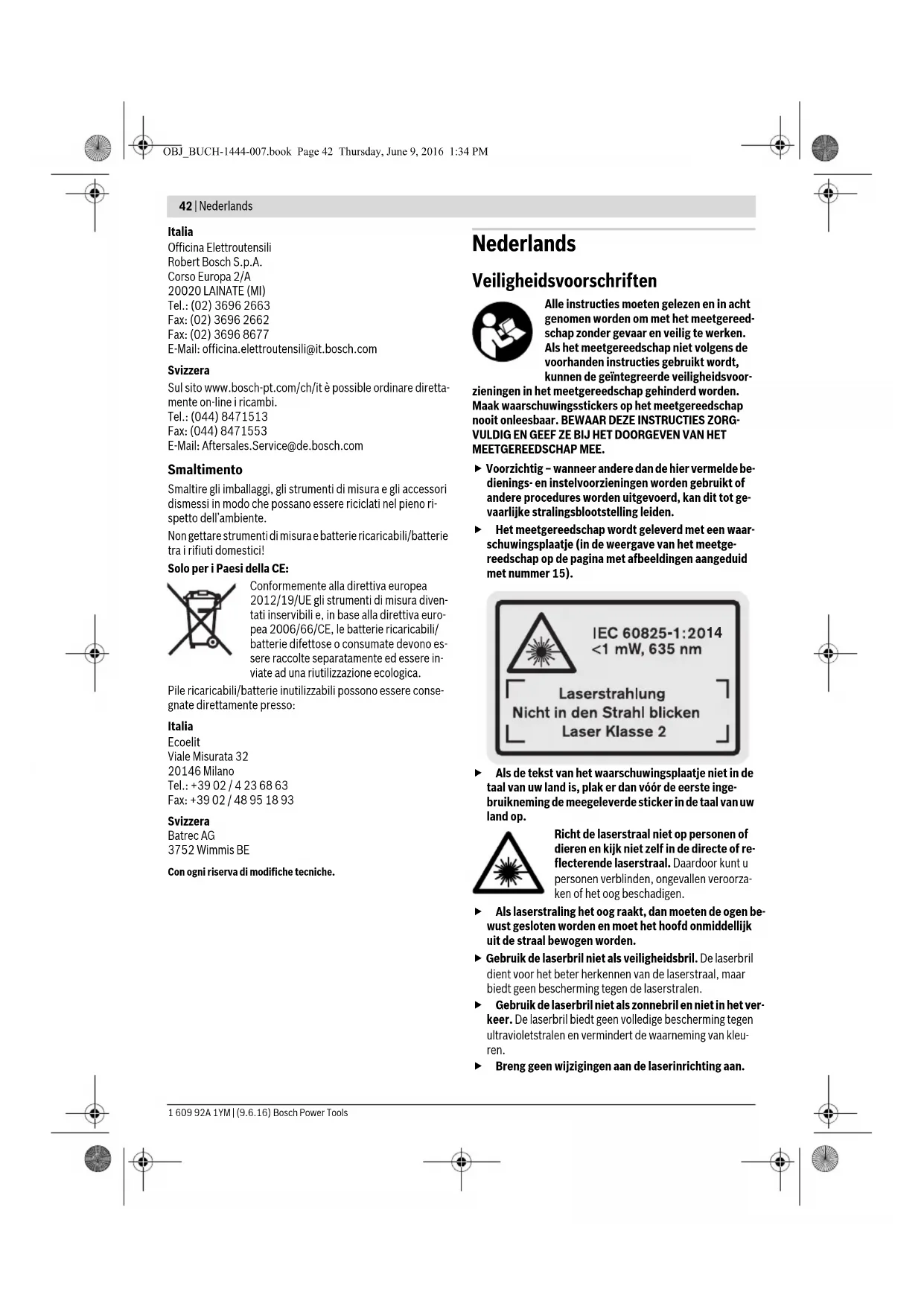 Regolato piano di riferimento sba- gliato Selezionare piano di ri- ferimento adatto alla mi- surazione Ostacolo sul percorso del raggio laser Il punto laser deve esse- re posizionato comple- tamente sulla superficie di puntamento. La visualizzazione rimane immutata oppure lo strumento di misura reagisce in modo inatteso all’attivazione dei tasti Errore nel software Togliere le batterie e av- viare di nuovo lo stru- mento di misura dopo averle inserite nuova- mente. Causa Rimedi OBJ_BUCH-1444-007.book Page 41 Thursday, June 9, 2016 1:34 PM42 | Nederlands 1 609 92A 1YM | (9.6.16) Bosch Power Tools Italia Officina Elettroutensili Robert Bosch S.p.A. Corso Europa 2/A 20020 LAINATE (MI) Tel.: (02) 3696 2663 Fax: (02) 3696 2662 Fax: (02) 3696 8677 E-Mail: officina.elettroutensili@it.bosch.com Svizzera Sul sito www.bosch-pt.com/ch/it è possible ordinare diretta- mente on-line i ricambi. Tel.: (044) 8471513 Fax: (044) 8471553 E-Mail: Aftersales.Service@de.bosch.com Smaltimento Smaltire gli imballaggi, gli strumenti di misura e gli accessori dismessi in modo che possano essere riciclati nel pieno ri- spetto dell’ambiente. Non gettare strumenti di misura e batterie ricaricabili/batterie tra i rifiuti domestici! Solo per i Paesi della CE: Conformemente alla direttiva europea 2012/19/UE gli strumenti di misura diven- tati inservibili e, in base alla direttiva euro- pea 2006/66/CE, le batterie ricaricabili/ batterie difettose o consumate devono es- sere raccolte separatamente ed essere in- viate ad una riutilizzazione ecologica. Pile ricaricabili/batterie inutilizzabili possono essere conse- gnate direttamente presso: Italia Ecoelit Viale Misurata 32 20146 Milano Tel.: +39 02 / 4 23 68 63 Fax: +39 02 / 48 95 18 93 Svizzera Batrec AG 3752 Wimmis BE Con ogni riserva di modifiche tecniche. Nederlands Veiligheidsvoorschriften Alle instructies moeten gelezen en in acht genomen worden om met het meetgereed- schap zonder gevaar en veilig te werken. Als het meetgereedschap niet volgens de voorhanden instructies gebruikt wordt, kunnen de geïntegreerde veiligheidsvoor- zieningen in het meetgereedschap gehinderd worden. Maak waarschuwingsstickers op het meetgereedschap nooit onleesbaar. BEWAAR DEZE INSTRUCTIES ZORG- VULDIG EN GEEF ZE BIJ HET DOORGEVEN VAN HET MEETGEREEDSCHAP MEE. Voorzichtig – wanneer andere dan de hier vermelde be- dienings- en instelvoorzieningen worden gebruikt of andere procedures worden uitgevoerd, kan dit tot ge- vaarlijke stralingsblootstelling leiden. Het meetgereedschap wordt geleverd met een waar- schuwingsplaatje (in de weergave van het meetge- reedschap op de pagina met afbeeldingen aangeduid met nummer 15). Als de tekst van het waarschuwingsplaatje niet in de taal van uw land is, plak er dan vóór de eerste inge- bruikneming de meegeleverde sticker in de taal van uw land op. Richt de laserstraal niet op personen of dieren en kijk niet zelf in de directe of re- flecterende laserstraal. Daardoor kunt u personen verblinden, ongevallen veroorza- ken of het oog beschadigen. Als laserstraling het oog raakt, dan moeten de ogen be- wust gesloten worden en moet het hoofd onmiddellijk uit de straal bewogen worden. Gebruik de laserbril niet als veiligheidsbril. De laserbril dient voor het beter herkennen van de laserstraal, maar biedt geen bescherming tegen de laserstralen. Gebruik de laserbril niet als zonnebril en niet in het ver- keer. De laserbril biedt geen volledige bescherming tegen ultravioletstralen en vermindert de waarneming van kleu- ren. Breng geen wijzigingen aan de laserinrichting aan.