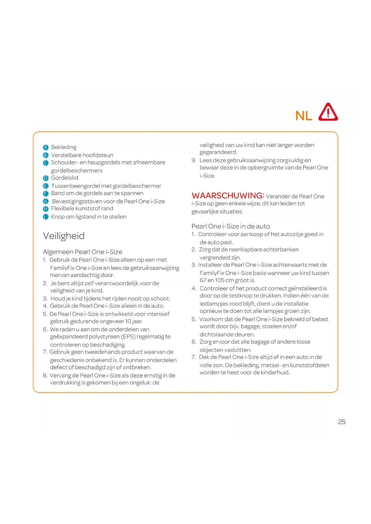 vergrendeld zijn. Milieu Houd plastic verpakkingsmaterialen uit de buurt van jouw kind om verstikkingsgevaar te verkomen. Wanneer je het product niet meer gebruikt verzoeken wij je vanuit milieuoogpunt het product gescheiden bij het afval te plaatsen conform de lokale wetgeving. Vragen Voor vragen kan je contact opnemen met de lokale verkoper van Maxi-Cosi (zie www.maxi-cosi.com voor contactgegevens). Zorg dat je de volgende gegevens bij de hand hebt: - Serienummer onderop de oranje ECE sticker; - Merk, type auto en stoel waarop de Maxi-Cosi Pearl One i-Size wordt gebruikt; - Leeftijd (lengte) en gewicht van je kind. Garantie Wij geven 24 maanden garantie. Dit geeft ons vertrouwen weer in de hoogwaardige kwaliteit van het ontwerp, de techniek, het product en de productprestaties. Wij garanderen dat dit product vervaardigd is overeenkomstig de actuele Europese veiligheidsvoorschriften en kwaliteitsnormen die op dit product van toepassing zijn, en dat dit product op het moment van aanschaf vrij is van materiaal- en constructiefouten. Onder de hierin vermelde voorwaarden kan deze garantie worden ingeroepen door de eerste eindgebruiker in de landen waar dit product verkocht wordt door een dochterfirma van de Dorel Group of door een erkende dealer of erkende detailhandelaar. NL27 Onze garantie van 24 maanden omvat gebreken met betrekking tot de materialen en de constructie bij gebruik onder normale omstandigheden en over- eenkomstig met onze handleiding voor een periode van 24 maanden vanaf de datum van de originele aankoop in de winkel door de eerste eindgebruiker. Voor een reparatieverzoek of een verzoek om reserveonderdelen vallende onder de garantie, dient u een aankoopbewijs te overhandigen dat binnen 24 maanden voorafgaand aan het serviceverzoek dient te zijn afgegeven. Onze garantie van 24 maanden geldt niet voor gebreken die veroorzaakt worden door normale sli- jtage, schade veroorzaakt door ongevallen, verkeerd gebruik, nalatigheid, brand, contact met vloeistoffen of andere externe oorzaken, schade die het gevolg is van het niet naleven van de handleiding, schade veroorzaakt door gebruik in combinatie met een ander product, schade die veroorzaakt wordt door onderhoud uitgevoerd door iemand die niet door ons is goedgekeurd, of wanneer het product is gestolen, wanneer een label of identificatienummer van het product werd verwijderd of gewijzigd. Voorbeelden van normale slijtage zijn slijtage van textiel door regelmatig gebruik en de natuurlijke verbleking van kleuren en materialen door de normale veroudering van het product. Wat u kunt doen ingeval van gebreken: Mocht zich een probleem of gebrek voordoen, dan is de door ons erkende dealer of winkelier uw eerste aanspreekpunt. Onze garantie van 24 maanden wordt door hen erkend (1) . U dient een aankoop- bewijs te overhandigen dat binnen 24 maanden voorafgaand aan het verzoek dient te zijn afgegeven. Het is het eenvoudigst wanneer u uw serviceverzoek vooraf door ons laat goedkeuren. Wanneer u een claim indient die geldig is onder deze garantie, is het mogelijk dat we u vragen uw product terug te sturen naar de door ons erkende dealer of winkel of het product naar ons op te sturen in overeen- stemming met onze instructies. Wij zullen de kosten voor de verzending en terugzending betalen indien alle instructies nageleefd worden. Schade en/of gebreken die niet gedekt worden door onze garantie noch door de wettelijke rechten van de consument en/of schade en/of defecten met betrekking tot het product die niet gedekt worden door onze garantie kunnen behandeld worden tegen betaling van een redelijke vergoeding. Consumentenrechten: Een consument heeft wettelijke rechten in overeenstemming met de van toepassing zijnde consumentenwetgeving, die van land tot land kan verschillen. De rechten van de consument onder de van toepassing zijnde nationale wetgeving worden door deze garantie niet aangetast. Lifetime Warranty: Als onderdeel van onze Algemene Voorwaarden, die terug te vinden zijn op onze website www.maxi-cosi.com/lifetimewarranty, bieden wij een vrijwillige levenslange fabrieksgarantie voor eerste gebruikers. Om van deze levenslange garantie te genieten, dient u zich te registreren via onze website. Deze garantie wordt verstrekt door Dorel Nederland. We zijn geregistreerd onder bedrijfsnummer 17060920. Ons bedrijfsadres is Korendijk 5, 5707 RD NL28 Helmond, Nederland, en ons postadres is Postbus 6071, 5700 ET Helmond, Nederland. De namen en de adressen van andere bedrijven van de Dorel Group kunnen teruggevonden worden op de laatste pagina van deze handleiding en op onze website voor het betreffende merk. (1) Producten die gekocht zijn van wederverkopers of leveranciers die het etiket of het identificatienummer hebben gewijzigd of verwijderd, worden als niet-toegelaten producten beschouwd. Producten die gekocht zijn van niet erkende wederverkoper worden ook als niet-toegelaten producten beschouwd. Op de desbetreffende producten is geen garantie van toepassing, aangezien de echtheid van die producten niet kan worden vastgesteld. NL29