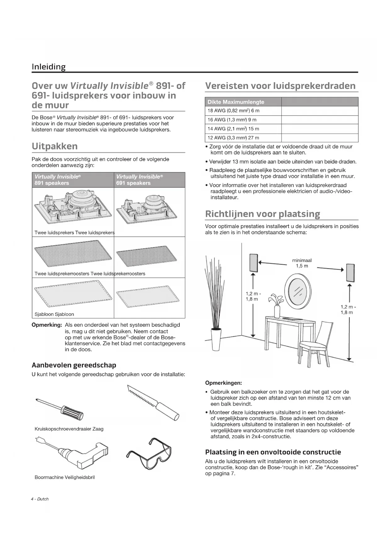 -dealer of de Bose- klantenservice. Zie het blad met contactgegevens in de doos. Aanbevolen gereedschap U kunt het volgende gereedschap gebruiken voor de installatie: Kruiskopschroevendraaier ZaagBoormachine Veiligheidsbril Vereisten voor luidsprekerdraden Dikte Maximumlengte 18 AWG (0,82 mm ) 6 m16 AWG (1,3 mm ) 9 m14 AWG (2,1 mm ) 15 m12 AWG (3,3 mm ) 27 m