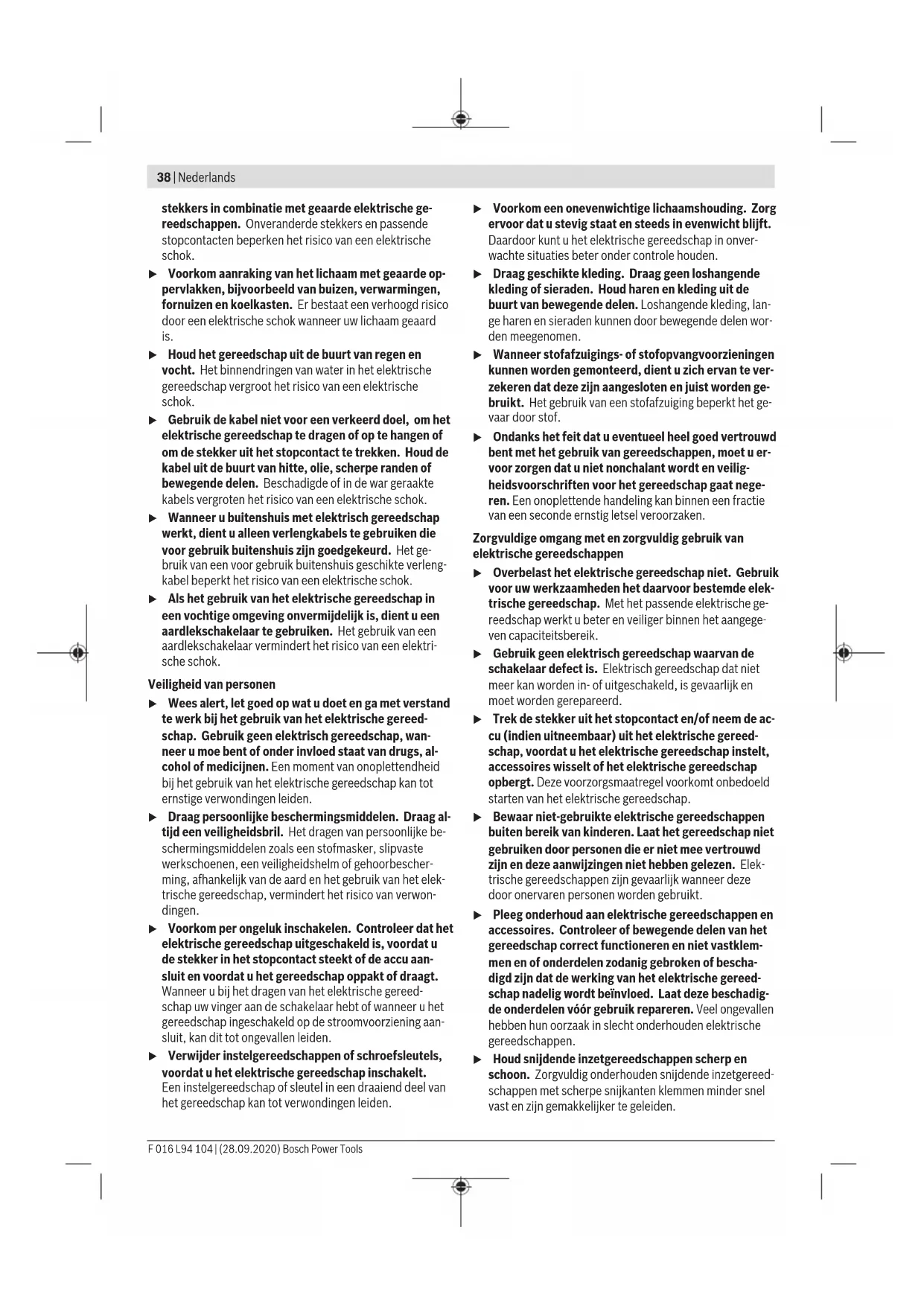 – Maximale lengte 30m voor verlengkabels of 60m voor kabeltrommels met veiligheidsschakelaar Let op: Als u een verlengkabel gebruikt, moet deze (zoals bij de veiligheidsvoorschriften beschreven) een aardedraad be- zitten die via de stekker met de aardedraad van uw elektri- sche installatie verbonden is. VOORZICHTIG: Verlengkabels die niet vol- gens de voorschriften zijn, kunnen gevaar- lijk zijn. Verlengkabels, stekkers en contra- stekkers moeten waterdicht uitgevoerd en voor gebruik buitenshuis goedgekeurd zijn. Symbolen De volgende symbolen zijn van betekenis voor het lezen en begrijpen van de gebruiksaanwijzing. Zorg ervoor dat u de symbolen en hun betekenis herkent. Het juiste begrip van de symbolen helpt u het product goed en veilig te gebruiken. Symbool Betekenis Draag werkhandschoenen Draag een veiligheidsbril Bewegingsrichting Reactierichting Gewicht Inschakelen Uitschakelen CLICK! Hoorbaar geluid Verboden handeling Toebehoren en vervangingsonderdelen Product- en vermogensbeschrijving Lees alle veiligheidsvoorschriften en in- structies. Als de veiligheidsvoorschriften en instructies niet worden opgevolgd, kan dit een elektrische schok, brand of ernstig letsel tot gevolg hebben. Neem de afbeeldingen in het achterste gedeelte van de ge- bruiksaanwijzing in acht. F 016 L94 104 | (28.09.2020) Bosch Power ToolsNederlands | 41 Gebruik volgens bestemming Het tuingereedschap is bestemd voor het knippen en snoei- en van heggen en struiken in de tuin voor particulier gebruik. Afgebeelde componenten (zie afbeeldingen A en