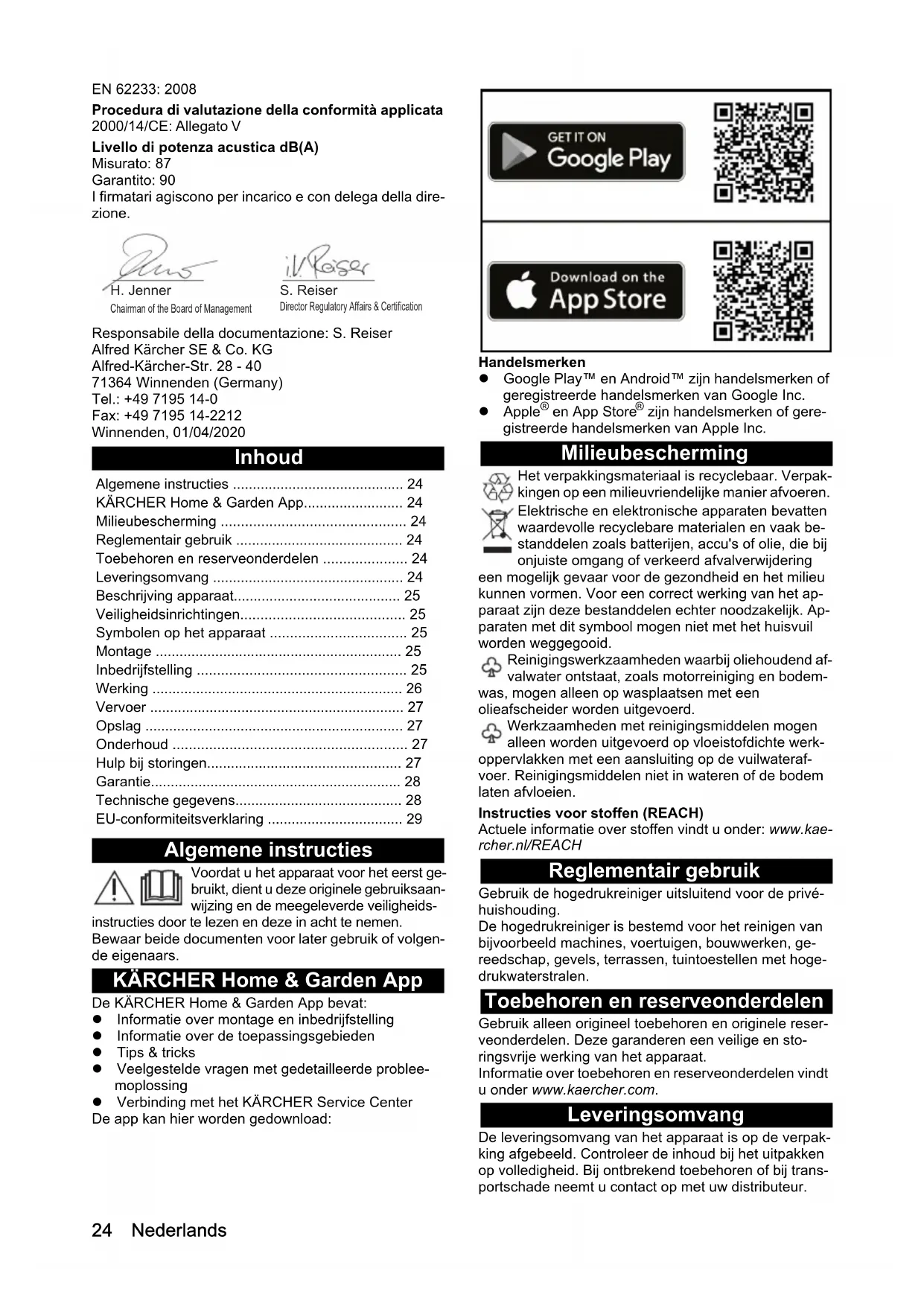 dB(A) 9024 Nederlands EN 62233: 2008 Procedura di valutazione della conformità applicata 2000/14/CE: Allegato V Livello di potenza acustica dB(A) Misurato: 87 Garantito: 90 I firmatari agiscono per incarico e con delega della dire- zione. Responsabile della documentazione: S. Reiser Alfred Kärcher SE & Co. KG Alfred-Kärcher-Str. 28 - 40 71364 Winnenden (Germany) Tel.: +49 7195 14-0 Fax: +49 7195 14-2212 Winnenden, 01/04/2020 Inhoud Algemene instructies Voordat u het apparaat voor het eerst ge- bruikt, dient u deze originele gebruiksaan- wijzing en de meegeleverde veiligheids- instructies door te lezen en deze in acht te nemen. Bewaar beide documenten voor later gebruik of volgen- de eigenaars. KÄRCHER Home & Garden App De KÄRCHER Home & Garden App bevat: Informatie over montage en inbedrijfstelling Informatie over de toepassingsgebieden Tips & tricks Veelgestelde vragen met gedetailleerde problee- moplossing Verbinding met het KÄRCHER Service Center De app kan hier worden gedownload: Handelsmerken Google Play™ en Android™ zijn handelsmerken of geregistreerde handelsmerken van Google Inc. Apple
