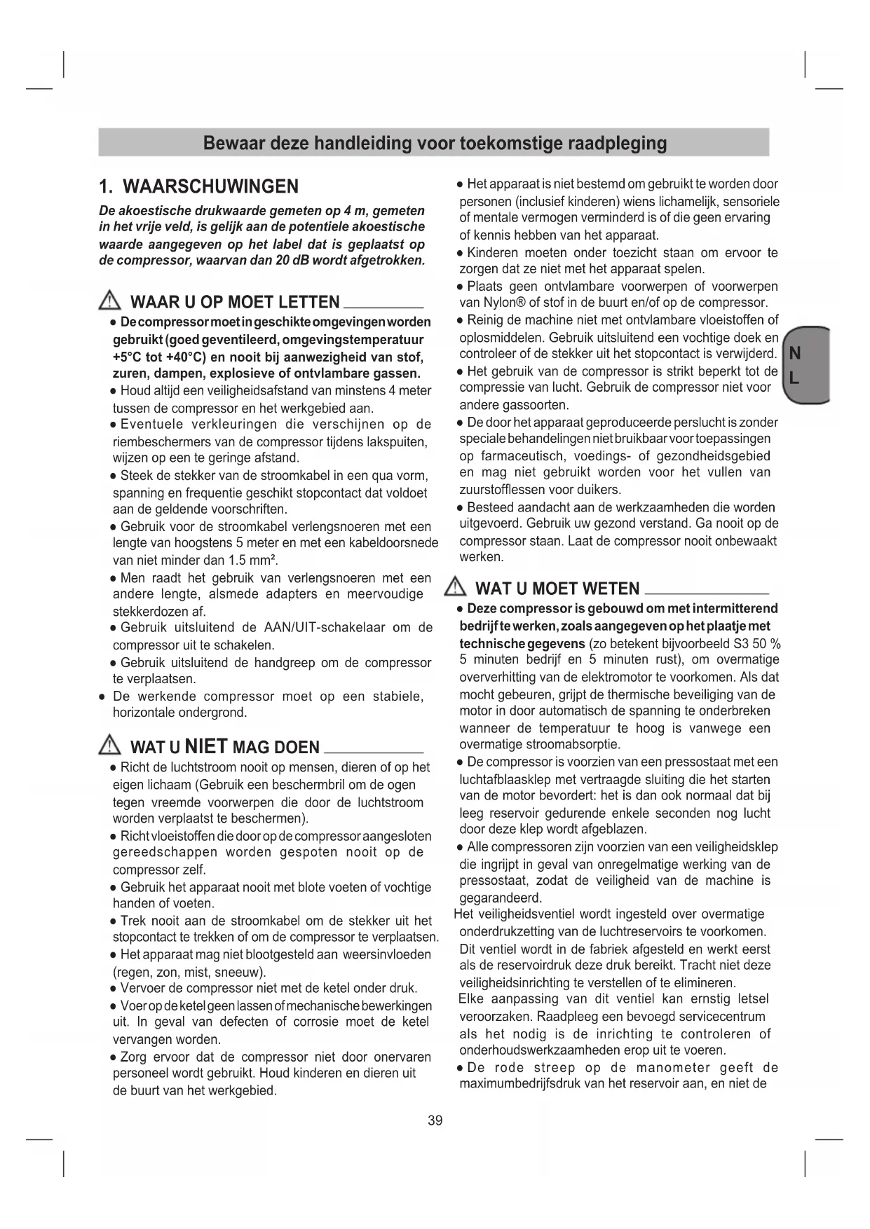 ● Deze compressor is gebouwd om met intermitterend bedrijf te werken, zoals aangegeven op het plaatje met technische gegevens (zo betekent bijvoorbeeld S3 50 % 5 minuten bedrijf en 5 minuten rust), om overmatige oververhitting van de elektromotor te voorkomen. Als dat mocht gebeuren, grijpt de thermische beveiliging van de motor in door automatisch de spanning te onderbreken wanneer de temperatuur te hoog is vanwege een overmatige stroomabsorptie. ● De compressor is voorzien van een pressostaat met een luchtafblaasklep met vertraagde sluiting die het starten van de motor bevordert: het is dan ook normaal dat bij leeg reservoir gedurende enkele seconden nog lucht door deze klep wordt afgeblazen. ● Alle compressoren zijn voorzien van een veiligheidsklep die ingrijpt in geval van onregelmatige werking van de pressostaat, zodat de veiligheid van de machine is gegarandeerd. Het veiligheidsventiel wordt ingesteld over overmatige onderdrukzetting van de luchtreservoirs te voorkomen. Dit ventiel wordt in de fabriek afgesteld en werkt eerst als de reservoirdruk deze druk bereikt. Tracht niet deze veiligheidsinrichting te verstellen of te elimineren. Elke aanpassing van dit ventiel kan ernstig letsel veroorzaken. Raadpleeg een bevoegd servicecentrum als het nodig is de inrichting te controleren of onderhoudswerkzaamheden erop uit te voeren. ● De rode streep op de manometer geeft de maximumbedrijfsdruk van het reservoir aan, en niet de40