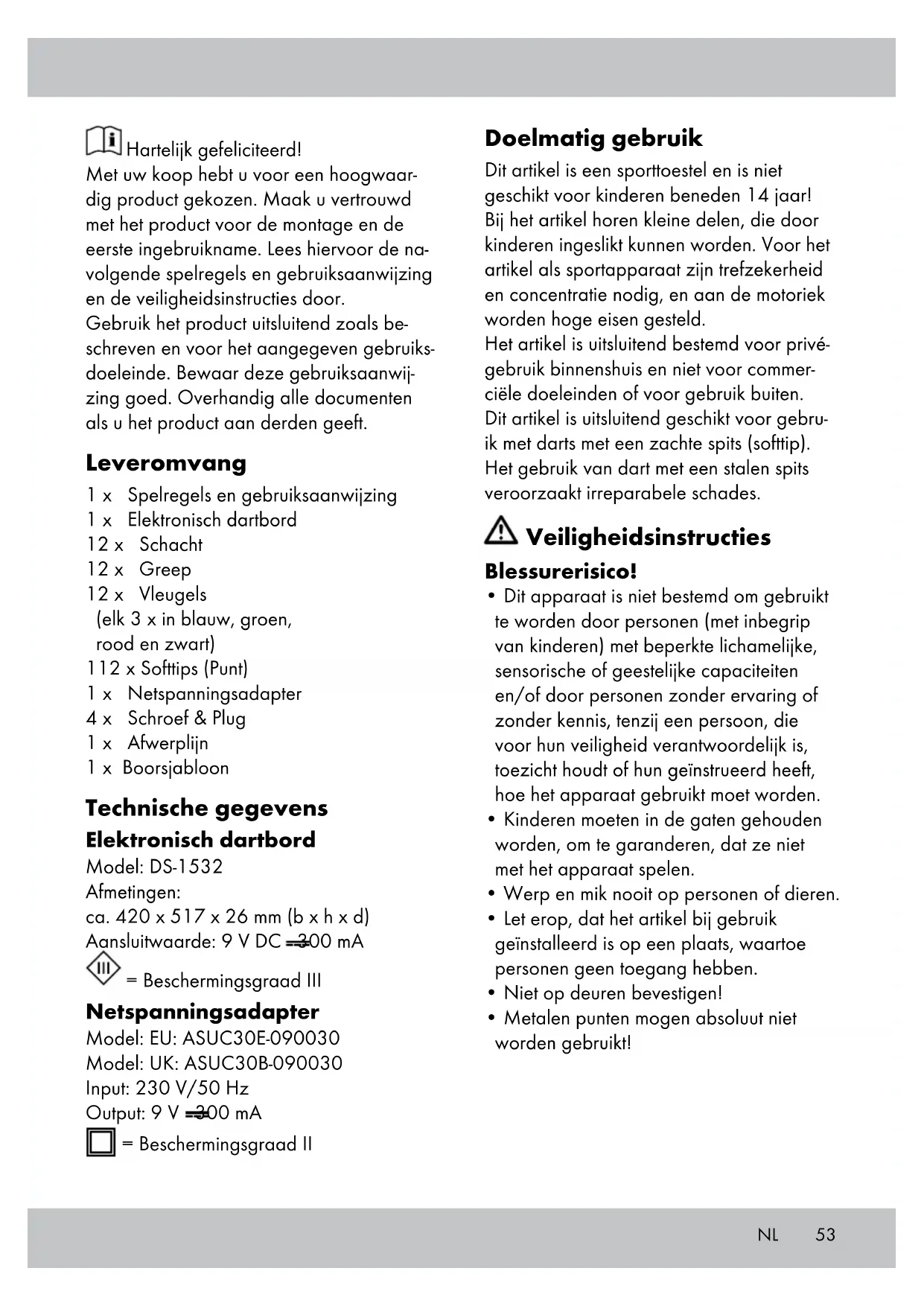 Onderhoud, verzorging, opbergen BELANGRIJK! Voor het reinigen met een vochtige doek dient u de stroomstekker uit de wandcontact- doos te halen. Reinig alleen het dartboard met een vochtige doek! De stroomadapter mag niet in contact komen met vocht! Bij regelmatig gebruik van het artikel, wordt het vooral aan de voorkant vuil door aan- raking met de vingers. Maak de voorkant, de toetsen en de vensters met een vochtige doek schoon. Als oplosmiddel wordt water met een beetje afwasmiddel aanbevolen. Daarna afvegen met een droge, zachte doek. Dek het artikel af, wanneer u het voor langere tijd niet gebruikt, om het tegen stof te beschermen. Het artikel altijd droog en schoon in een ruimte met gematigde tempe- ratuur bewaren. Opmerking met betrekking tot de verwijdering Verwijder het product en alle bijbehorende componenten altijd via een geautoriseerd verwijderingsbedrijf of via uw gemeentelijk verwijderingsbedrijf. Respecteer de actueel geldende voorschriften. Informeert u zich in geval van twijfel bij uw verwijderingsbedrijf over een verwijdering die rekening houdt met het milieu. Elektrische apparaten horen niet in het huisvuil.68 Congratulations on purchasing this high-quality product. Be sure to familiarise yourself with the assembly instructions prior to use. Please take the time to carefully read through the following playing and user instructions and safety notes. Only use the product as described and for the intended use. Please retain these instructions for future reference and ensure that they are passed on to any third party. Scope of Delivery 1 x playing and user instructions 1 x electronic dartboard 12 x shaft 12 x grip 12 x flight (each 3 x in blue, green, red and black) 112 x soft tips (tip) 1 x power adapter 4 x screws & wall plug 1 x scratch line 1 x drilling template Technical data Electronic Dartboard Model: DS-1532 Dimensions: approx. 420 x 517 x 26mm (W x H x D) Power rating: 9V DC 300mA = Safety class III Power adapter Model: EU: ASUC30E-090030 Model: UK: ASUC30B-090030 Input: 230V/50Hz Output: 9V 300mA = Safety class II Intended use This dartboard product is a sports item and is not suitable for children under 14-years- old! The item contains small parts which could be swallowed by children and, as sports equipment, it requires pin-point accu- racy and concentration, as well as a high level of motor skills. The item has been designed for private use indoors, and is not intended for commercial use or for use outdoors. This item is to be used exclusively with darts fitted with soft tips. If used with darts fitted with steel tips this will cause irreparable damage. Safety instructions Danger of injury!
