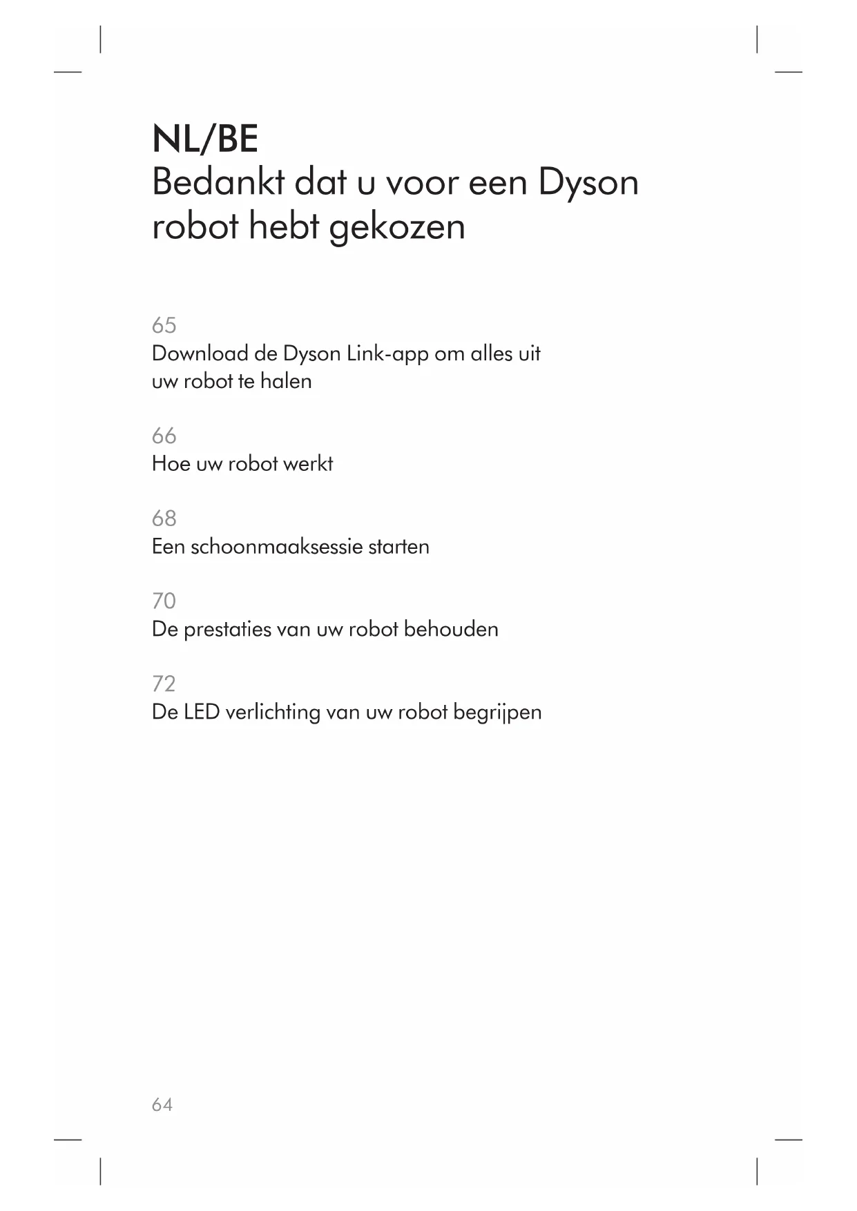 woordmerk en logo’s zijn geregistreerde handelsmerken in bezit van de Bluetooth SIG, Inc. en elk gebruik van dergelijke merken door Dyson vindt plaats onder licentie.66 Hoe uw robot werkt Krijg de beste schoonmaakprestaties. Navigatie Een speciaal ontwikkeld optisch systeem dat uw robot door uw huis leidt. Uw robot heeft een beeld van 360°om de locatie in uw huis te bepalen. De robot gebruikt ook infraroodsensoren om de grootte van uw huis te bepalen en obstakels als meubels te vermijden. Schoonmaken Uw robot gebruikt een combinatie van gepatenteerde Dyson- technologieën om uw huis schoon te houden. Uw robot gebruikt een borstel met volle breedte om ook in de hoeken te komen en een aantal vermogensniveaus voor de Dyson digitale motor om alle vloertypen schoon te maken. Personalisatie Gebruik de Dyson Link- app om in te stellen hoe en wanneer uw robot schoonmaakt. Maak een schema voor uw robot en laat hem weten wanneer er schoongemaakt moet worden. Kies uit drie vermogensmodi en pas uw robot aan op uw huis.67 Verlichting LED verlichting helpt u robot om schoon te maken bij weinig licht. Uw robot detecteert ruimten met weinig licht en gebruikt een ring van LED lampjes om deze ruimten selectief te verlichten en zo te helpen bij het navigeren. Werkduur en opladen De werkduur en laadtijden van uw robot zijn altijd schattingen. U hoeft niet te wachten tot uw robot volledig is opgeladen voor u kunt starten met schoonmaken. Uw robot wordt automatisch opgeladen als deze is gestart vanaf het oplaadstation. Tijdens het schoonmaken zal de robot niet volledig worden opgeladen voordat hij verdergaat, om de schoonmaaktijd te optimaliseren. Voor meer informatie en ondersteuning: Online: NL: www.dyson.nl/support BE: www.dyson.be/support Telefonisch: NL: 080 002 06 203 BE: 0800 39208 LUX: 0800 62 4511 2