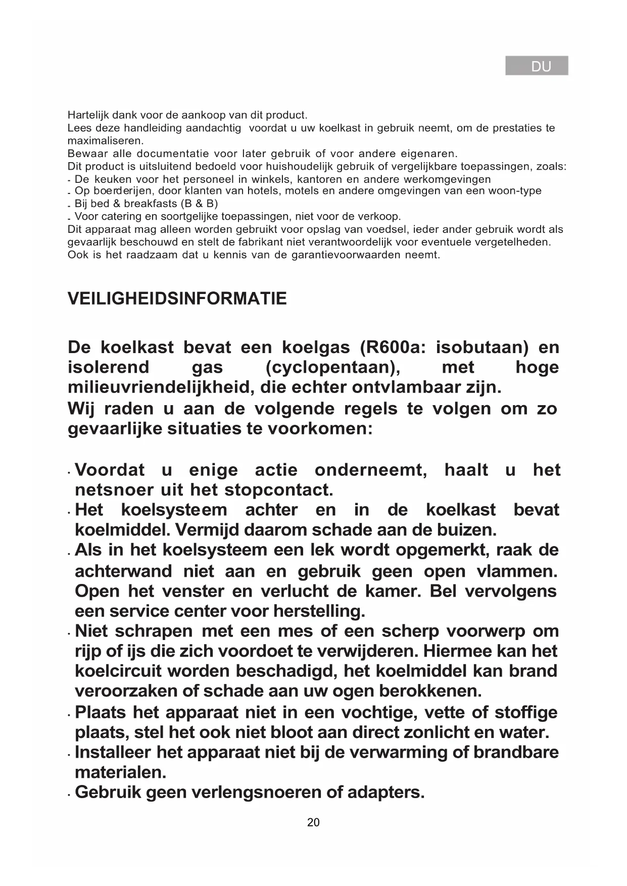 Bedankt voor de aankoop van dit product. Lees deze instructiehandleiding zorgvuldig door voordat u uw koelkast gaat gebruiken, voor de beste prestaties van het apparaat. Bewaar alle documentatie voor toekomstig gebruik of voor andere eigenaren. Dit product is uitsluitend bedoeld voor huishoudelijk gebruik of voor soortgelijke toepassingen, zoals: ‐ de keukenruimte voor personeel in winkels, kantoren en andere werkomgevingen ‐ op boerderijen, door gasten van hotels, motels en andere woonomgevingen ‐ in bed and breakfasts (B & B) ‐ voor cateringservices en dergelijke toepassingen die niet voor de kleinhandel zijn. Dit apparaat mag uitsluitend worden gebruikt voor het bewaren van voedsel. Elk ander gebruik moet als gevaarlijk worden beschouwd en de fabrikant is niet verantwoordelijk voor nalatigheid. Het is ook aan te raden om de garantievoorwaarden door te lezen. Voor de beste prestaties en probleemloze werking van uw apparaat, is het zeer belangrijk om deze instructies zorgvuldig te lezen. Als u deze instructies niet in acht neemt, kan uw recht op gratis onderhoud tijdens de garantieperiode vervallen. VEILIGHEIDSINFORMATIE In deze handleiding staat veel belangrijke veiligheidsinformatie. We raden u aan om deze instructies op een veilige plaats te bewaren om ze gemakkelijk te kunnen raadplegen en optimaal van uw apparaat gebruik te kunnen maken. De koelkast bevat een koelgas (R600a: isobutaan) en een isolerend gas (cyclopentaan), die milieuvriendelijk, maar wel brandbaar zijn. Voorzichtig: brandgevaar Als het koelcircuit beschadigd raakt: