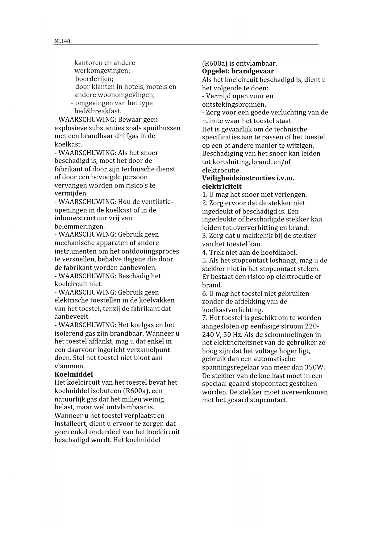 NL148 kantorenenandere werkomgevingen; - boerderijen; - doorklanteninhotels,motelsen anderewoonomgevingen; - omgevingenvanhettype bed&breakfast. ‐WAARSCHUWING:Bewaargeen explosievesubstantieszoalsspuitbussen meteenbrandbaardrijfgasinde koelkast. ‐WAARSCHUWING:Alshetsnoer beschadigdis,moethetdoorde fabrikantofdoorzijntechnischedienst ofdooreenbevoegdepersoon vervangenwordenomrisico’ste vermijden. ‐WAARSCHUWING:Houdeventilatie‐ openingenindekoelkastofinde inbouwstructuurvrijvan belemmeringen. ‐WAARSCHUWING:Gebruikgeen mechanischeapparatenofandere instrumentenomhetontdooiingsproces teversnellen,behalvedegenediedoor defabrikantwordenaanbevolen. ‐WAARSCHUWING:Beschadighet koelcircuitniet. ‐WAARSCHUWING:Gebruikgeen elektrischetoestellenindekoelvakken vanhettoestel,tenzijdefabrikantdat aanbeveelt. ‐WAARSCHUWING:Hetkoelgasenhet isolerendgaszijnbrandbaar.Wanneeru hettoestelafdankt,magudatenkelin eendaarvooringerichtverzamelpunt doen.Stelhettoestelnietblootaan vlammen. Koelmiddel Hetkoelcircuitvanhettoestelbevathet koelmiddelisobuteen(R600a),een natuurlijkgasdathetmilieuweinig belast,maarwelontvlambaaris. Wanneeruhettoestelverplaatsten installeert,dientuervoortezorgendat geenenkelonderdeelvanhetkoelcircuit beschadigdwordt.Hetkoelmiddel (R600a)isontvlambaar. Opgelet:brandgevaar Alshetkoelcircuitbeschadigdis,dientu hetvolgendetedoen: ‐Vermijdopenvuuren ontstekingsbronnen. ‐Zorgvooreengoedeverluchtingvande ruimtewaarhettoestelstaat. Hetisgevaarlijkomdetechnische specificatiesaantepassenofhettoestel opeenofanderemaniertewijzigen. Beschadigingvanhetsnoerkanleiden totkortsluiting,brand,en/of elektrocutie. Veiligheidsinstructiesi.v.m. elektriciteit 1.Umaghetsnoernietverlengen. 2.Zorgervoordatdestekkerniet ingedeuktofbeschadigdis.Een ingedeukteofbeschadigdestekkerkan leidentotoververhittingenbrand. 3.Zorgdatumakkelijkbijdestekker vanhettoestelkan. 4.Treknietaandehoofdkabel. 5.Alshetstopcontactloshangt,magude stekkernietinhetstopcontactsteken. Erbestaateenrisicoopelektrocutieof brand. 6.Umaghettoestelnietgebruiken zonderdeafdekkingvande koelkastverlichting. 7.Hettoestelisgeschiktomteworden aangeslotenopeenfasigestroom220‐ 240V,50Hz.Alsdeschommelingenin hetelektriciteitsnetvandegebruikerzo hoogzijndathetvoltagehogerligt, gebruikdaneenautomatische spanningsregelaarvanmeerdan350W. Destekkervandekoelkastmoetineen speciaalgeaardstopcontactgestoken worden.Destekkermoetovereenkomen methetgeaardstopcontact.