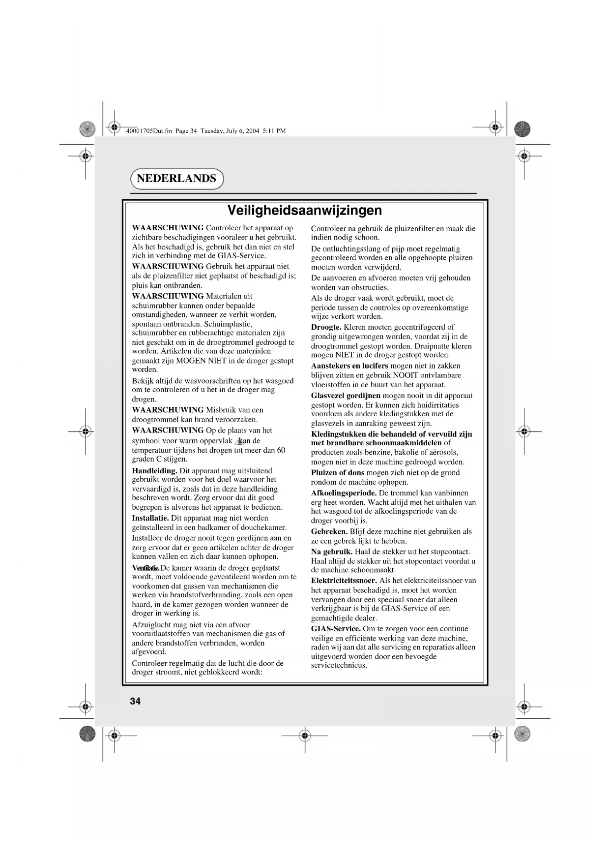 Veiligheidsaanwijzingen WAARSCHUWING Controleer het apparaat op zichtbare beschadigingen vooraleer u het gebruikt. Als het beschadigd is, gebruik het dan niet en stel zich in verbinding met de GIAS-Service. WAARSCHUWING Gebruik het apparaat niet als de pluizenfilter niet geplaatst of beschadigd is; pluis kan ontbranden. WAARSCHUWING Materialen uit schuimrubber kunnen onder bepaalde omstandigheden, wanneer ze verhit worden, spontaan ontbranden. Schuimplastic, schuimrubber en rubberachtige materialen zijn niet geschikt om in de droogtrommel gedroogd te worden. Artikelen die van deze materialen gemaakt zijn MOGEN NIET in de droger gestopt worden. Bekijk altijd de wasvoorschriften op het wasgoed om te controleren of u het in de droger mag drogen. WAARSCHUWING Misbruik van een droogtrommel kan brand veroorzaken. WAARSCHUWING Op de plaats van het symbool voor warm oppervlak kan de temperatuur tijdens het drogen tot meer dan 60 graden C stijgen. Handleiding. Dit apparaat mag uitsluitend gebruikt worden voor het doel waarvoor het vervaardigd is, zoals dat in deze handleiding beschreven wordt. Zorg ervoor dat dit goed begrepen is alvorens het apparaat te bedienen. Installatie. Dit apparaat mag niet worden geïnstalleerd in een badkamer of douchekamer. Installeer de droger nooit tegen gordijnen aan en zorg ervoor dat er geen artikelen achter de droger kunnen vallen en zich daar kunnen ophopen. Ventilatie. De kamer waarin de droger geplaatst wordt, moet voldoende geventileerd worden om te voorkomen dat gassen van mechanismen die werken via brandstofverbranding, zoals een open haard, in de kamer gezogen worden wanneer de droger in werking is. Afzuiglucht mag niet via een afvoer vooruitlaatstoffen van mechanismen die gas of andere brandstoffen verbranden, worden afgevoerd. Controleer regelmatig dat de lucht die door de droger stroomt, niet geblokkeerd wordt: Controleer na gebruik de pluizenfilter en maak die indien nodig schoon. De ontluchtingsslang of pijp moet regelmatig gecontroleerd worden en alle opgehoopte pluizen moeten worden verwijderd. De aanvoeren en afvoeren moeten vrij gehouden worden van obstructies. Als de droger vaak wordt gebruikt, moet de periode tussen de controles op overeenkomstige wijze verkort worden. Droogte. Kleren moeten gecentrifugeerd of grondig uitgewrongen worden, voordat zij in de droogtrommel gestopt worden. Druipnatte kleren mogen NIET in de droger gestopt worden. Aanstekers en lucifers mogen niet in zakken blijven zitten en gebruik NOOIT ontvlambare vloeistoffen in de buurt van het apparaat. Glasvezel gordijnen mogen nooit in dit apparaat gestopt worden. Er kunnen zich huidirritaties voordoen als andere kledingstukken met de glasvezels in aanraking geweest zijn. Kledingstukken die behandeld of vervuild zijn met brandbare schoonmaakmiddelen of producten zoals benzine, bakolie of aërosols, mogen niet in deze machine gedroogd worden. Pluizen of dons mogen zich niet op de grond rondom de machine ophopen. Afkoelingsperiode. De trommel kan vanbinnen erg heet worden. Wacht altijd met het uithalen van het wasgoed tot de afkoelingsperiode van de droger voorbij is. Gebreken. Blijf deze machine niet gebruiken als ze een gebrek lijkt te hebben. Na gebruik. Haal de stekker uit het stopcontact. Haal altijd de stekker uit het stopcontact voordat u de machine schoonmaakt. Elektriciteitssnoer. Als het elektriciteitssnoer van het apparaat beschadigd is, moet het worden vervangen door een speciaal snoer dat alleen verkrijgbaar is bij de GIAS-Service of een gemachtigde dealer. GIAS-Service. Om te zorgen voor een continue veilige en efficiënte werking van deze machine, raden wij aan dat alle servicing en reparaties alleen uitgevoerd worden door een bevoegde servicetechnicus. 40001705Dut.fm Page 34 Tuesday, July 6, 2004 5:11 PMNEDERLANDS