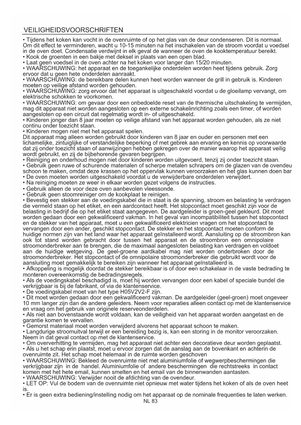 - WAARSCHUWING: Verwijder nooit de afdichting van de ovendeur. VEILIGHEIDSVOORSCHRIFTENNL 84 Inhoudsopgave Algemene Instructies