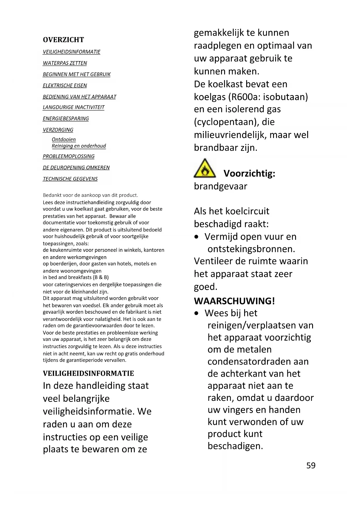 VELHOS Este aparelho está marcado de acordo com a Directiva europeia 2012/19/CE sobre Resíduos de Equipamento Eléctrico e Electrónico (DEEE). Os DEEE contêm substâncias poluentes (que podem causar consequências negativas para o ambiente) e componentes básicos (que podem ser reutilizados). É importante que os DEEE sejam submetidos a tratamentos específicos, de maneira a remover e eliminar adequadamente todos os poluentes, e recuperar e reciclar todos os materiais. Os indivíduos têm um papel importante ao assegurar que os DEEE não se tornam num problema ambiental, é essencial seguir algumas regras básicas: Os DEEE não devem ser tratados como resíduos domésticos. Os DEEE devem ser entregues nos pontos de recolha relevantes geridos pelo município ou por companhias registadas. Em muitos países, a recolha casa-a-casa, para DEEE de grandes dimensões, pode existir. Em muitos países, ao comprar um novo aparelho, o antigo pode ser devolvido ao comerciante que tem de o recolher sem qualquer custo, um-para-um, desde que o equipamento seja de tipo equivalente e tenha as mesmas funções que o equipamento fornecido. Conformidade Ao colocar a marca neste produto, estamos a confirmar a conformidade com todos os requisitos de segurança, saúde e ambiente relevantes que são aplicáveis na legislação sobre este produto.59 Nederlands OVERZICHT VEILIGHEIDSINFORMATIE WATERPAS ZETTEN BEGINNEN MET HET GEBRUIK ELEKTRISCHE EISEN BEDIENING VAN HET APPARAAT LANGDURIGE INACTIVITEIT ENERGIEBESPARING VERZORGING Ontdooien Reiniging en onderhoud PROBLEEMOPLOSSING DE DEUROPENING OMKEREN TECHNISCHE GEGEVENS Bedankt voor de aankoop van dit product. Lees deze instructiehandleiding zorgvuldig door voordat u uw koelkast gaat gebruiken, voor de beste prestaties van het apparaat. Bewaar alle documentatie voor toekomstig gebruik of voor andere eigenaren. Dit product is uitsluitend bedoeld voor huishoudelijk gebruik of voor soortgelijke toepassingen, zoals: de keukenruimte voor personeel in winkels, kantoren en andere werkomgevingen op boerderijen, door gasten van hotels, motels en andere woonomgevingen in bed and breakfasts (B & B) voor cateringservices en dergelijke toepassingen die niet voor de kleinhandel zijn. Dit apparaat mag uitsluitend worden gebruikt voor het bewaren van voedsel. Elk ander gebruik moet als gevaarlijk worden beschouwd en de fabrikant is niet verantwoordelijk voor nalatigheid. Het is ook aan te raden om de garantievoorwaarden door te lezen. Voor de beste prestaties en probleemloze werking van uw apparaat, is het zeer belangrijk om deze instructies zorgvuldig te lezen. Als u deze instructies niet in acht neemt, kan uw recht op gratis onderhoud tijdens de garantieperiode vervallen. VEILIGHEIDSINFORMATIE In deze handleiding staat veel belangrijke veiligheidsinformatie. We raden u aan om deze instructies op een veilige plaats te bewaren om ze gemakkelijk te kunnen raadplegen en optimaal van uw apparaat gebruik te kunnen maken. De koelkast bevat een koelgas (R600a: isobutaan) en een isolerend gas (cyclopentaan), die milieuvriendelijk, maar wel brandbaar zijn. Voorzichtig: brandgevaar Als het koelcircuit beschadigd raakt: