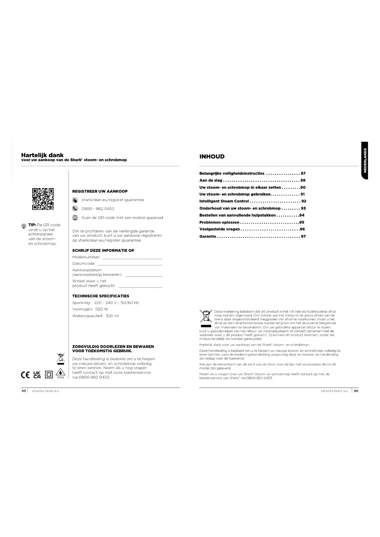 Deze handleiding is bedoeld om u te helpen uw nieuwe stoom- en schrobmop volledig teleren kennen. Neem als u nog vragen heeftcontact op met onze klantenservice via0800-862 0453. Om te profiteren van de verlengde garantie van uw product, kunt u uw aankoop registreren op sharkclean.eu/register-guarantee TECHNISCHE SPECIFICATIES Spanning: 220 - 240 V~, 50/60 Hz Vermogen: 1120 W Watercapaciteit: 320 ml