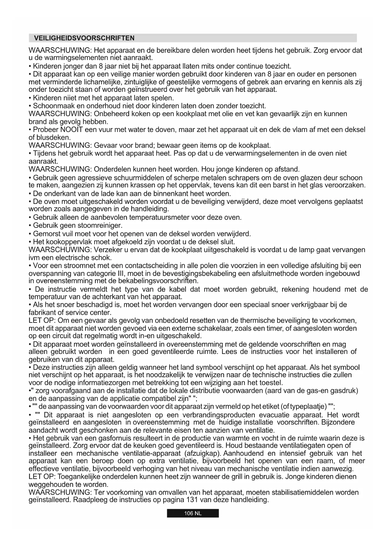 - Het gebruik van een gasfornuis resulteert in de productie van warmte en vocht in de ruimte waarin deze is geïnstalleerd. Zorg ervoor dat de keuken goed geventileerd is. Houd bestaande ventilatiegaten open of installeer een mechanische ventilatie-apparaat (afzuigkap). Aanhoudend en intensief gebruik van het apparaat kan een beroep doen op extra ventilatie, bijvoorbeeld het openen van een raam, of meer effectieve ventilatie, bijvoorbeeld verhoging van het niveau van mechanische ventilatie indien aanwezig. LET OP: Toegankelijke onderdelen kunnen heet zijn wanneer de grill in gebruik is. Jonge kinderen dienen weggehouden te worden. WAARSCHUWING: Ter voorkoming van omvallen van het apparaat, moeten stabilisatiemiddelen worden geïnstalleerd. Raadpleeg de instructies op pagina 131 van deze handleiding. VEILIGHEIDSVOORSCHRIFTEN 106 NL107 NL