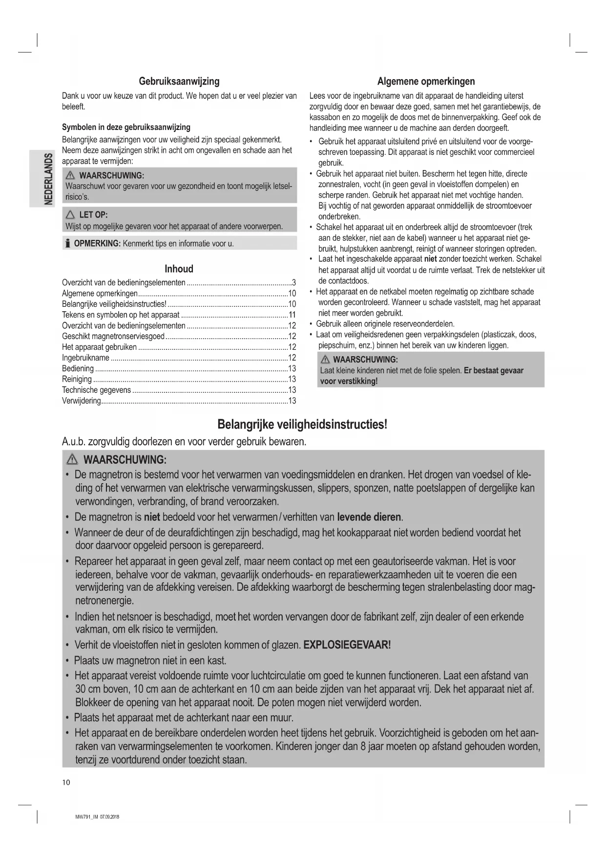 - Het apparaat en de bereikbare onderdelen worden heet tijdens het gebruik. Voorzichtigheid is geboden om het aan- raken van verwarmingselementen te voorkomen. Kinderen jonger dan 8 jaar moeten op afstand gehouden worden, tenzij ze voortdurend onder toezicht staan.11 MW791_IM 07.09.2018 WAARSCHUWING: