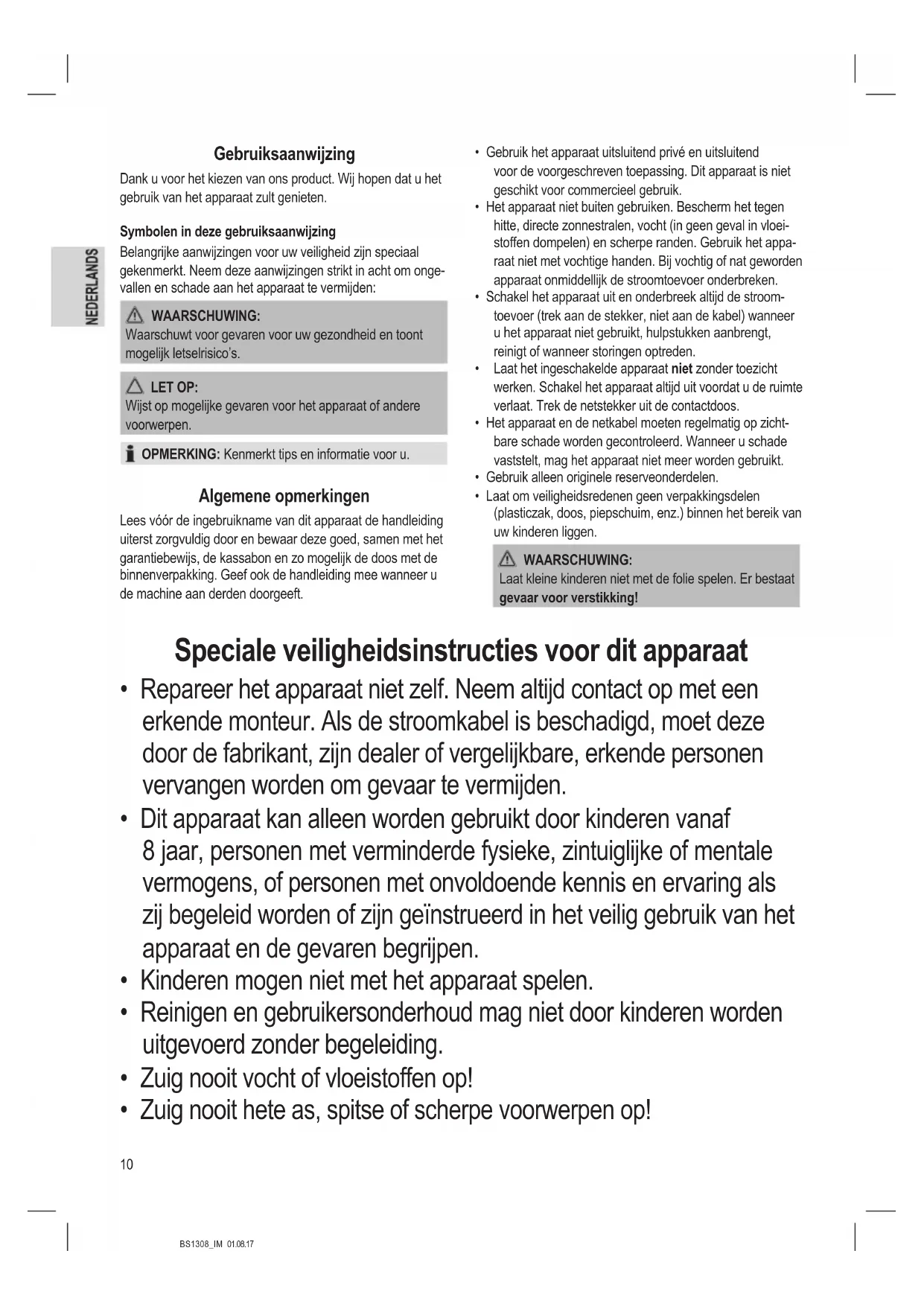 - Zuig nooit hete as, spitse of scherpe voorwerpen op!11 BS1308_IM 01.08.17