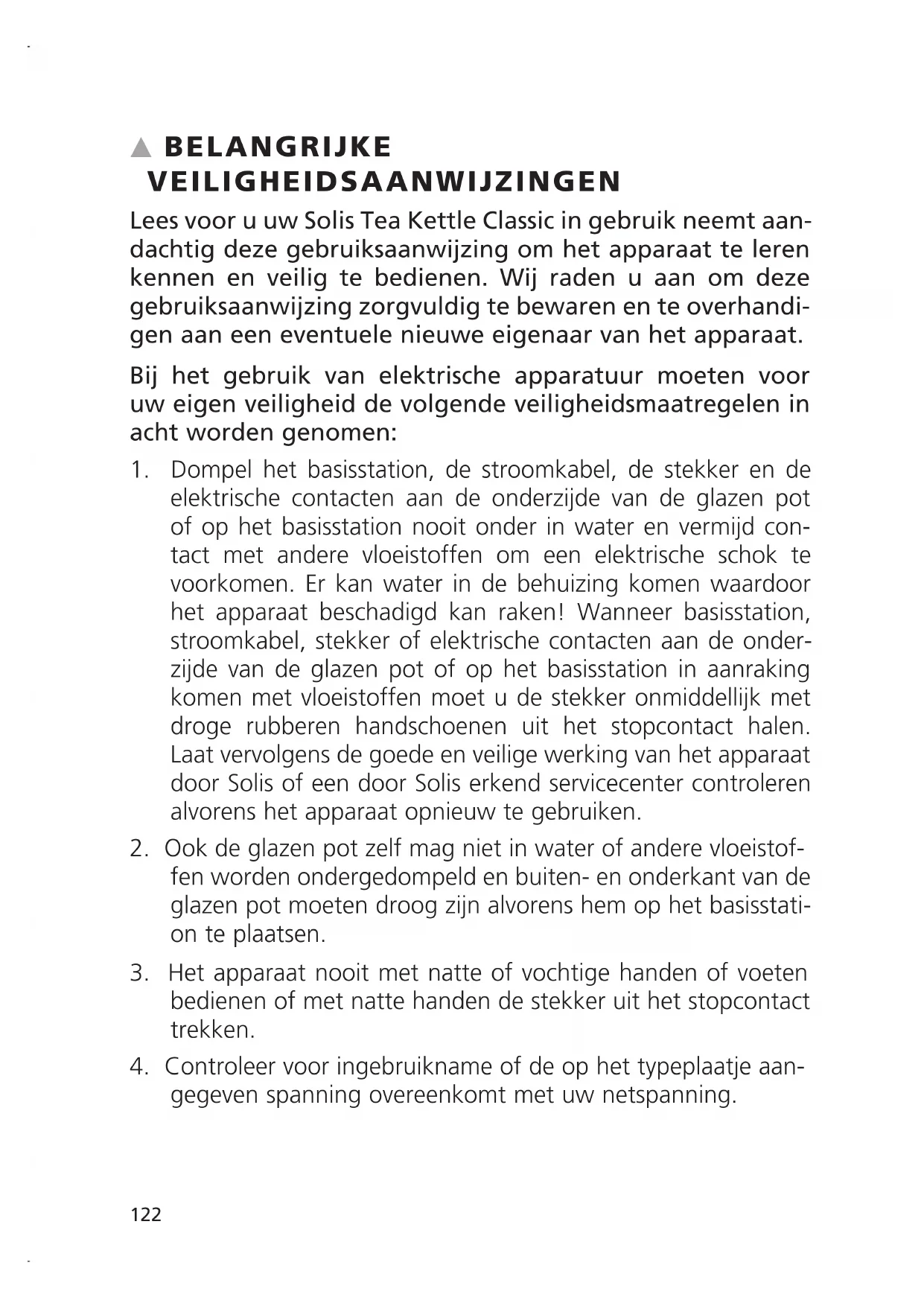 Keep the original packaging in a safe place so that you may use it in the event that transportation or shipping of the product becomes necessary.solis aG Solis-House • CH-8152 Glattbrugg-Zurich • Switzerland Phone +41 44 874 64 54 • Fax +41 44 874 64 99 info@solis.ch • www.solis.ch • www.solis.coms BELANGRIJKE VEILIGHEIDSAANWIJZINGEN Lees voor u uw Solis Tea Kettle Classic in gebruik neemt aan- dachtig deze gebruiksaanwijzing om het apparaat te leren kennen en veilig te bedienen. Wij raden u aan om deze gebruiksaanwijzing zorgvuldig te bewaren en te overhandi- gen aan een eventuele nieuwe eigenaar van het apparaat. Bij het gebruik van elektrische apparatuur moeten voor uw eigen veiligheid de volgende veiligheidsmaatregelen in acht worden genomen: