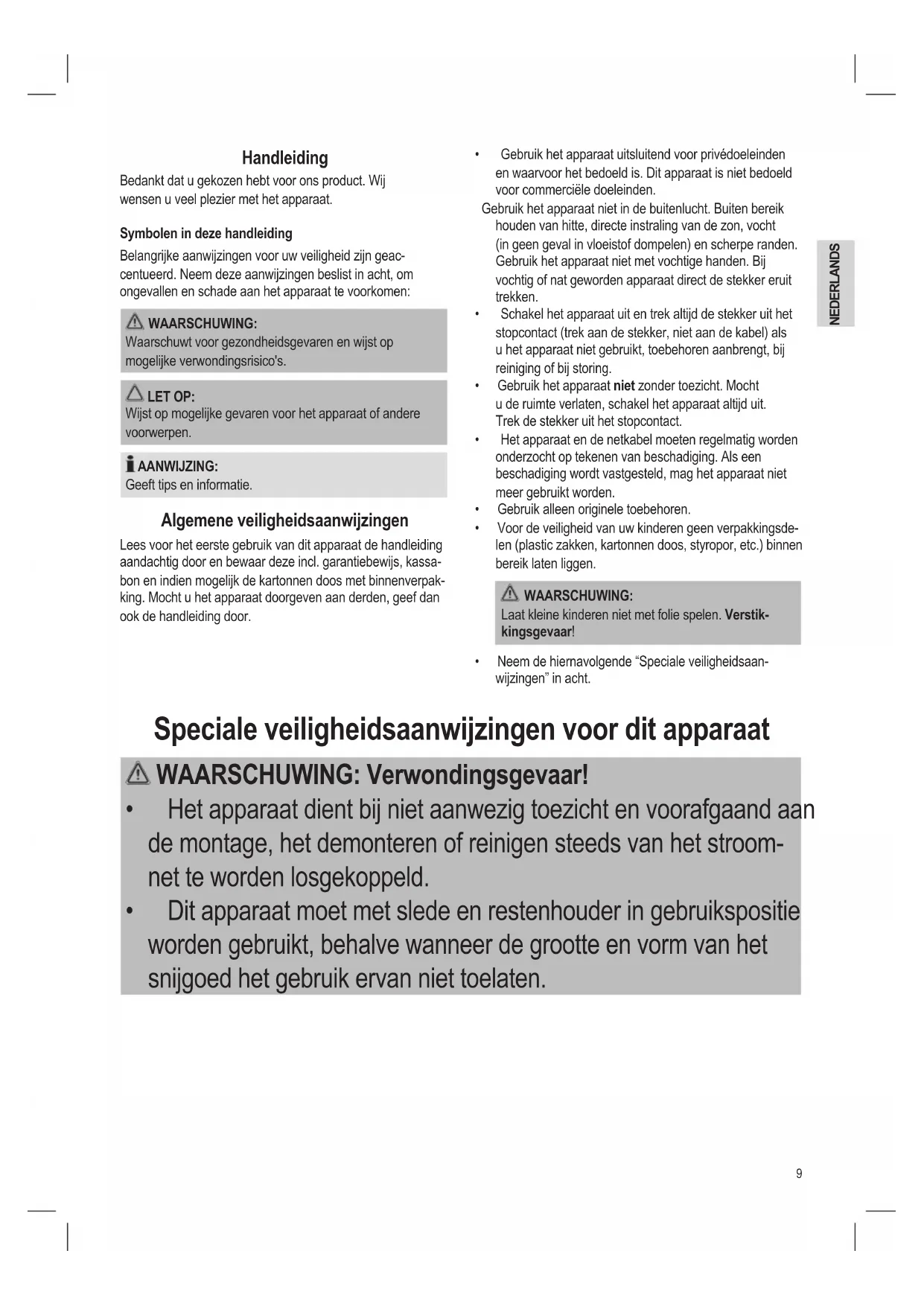 - Neemdehiernavolgende“Specialeveiligheidsaan- wijzingen” in acht. Speciale veiligheidsaanwijzingen voor dit apparaat WAARSCHUWING: Verwondingsgevaar!