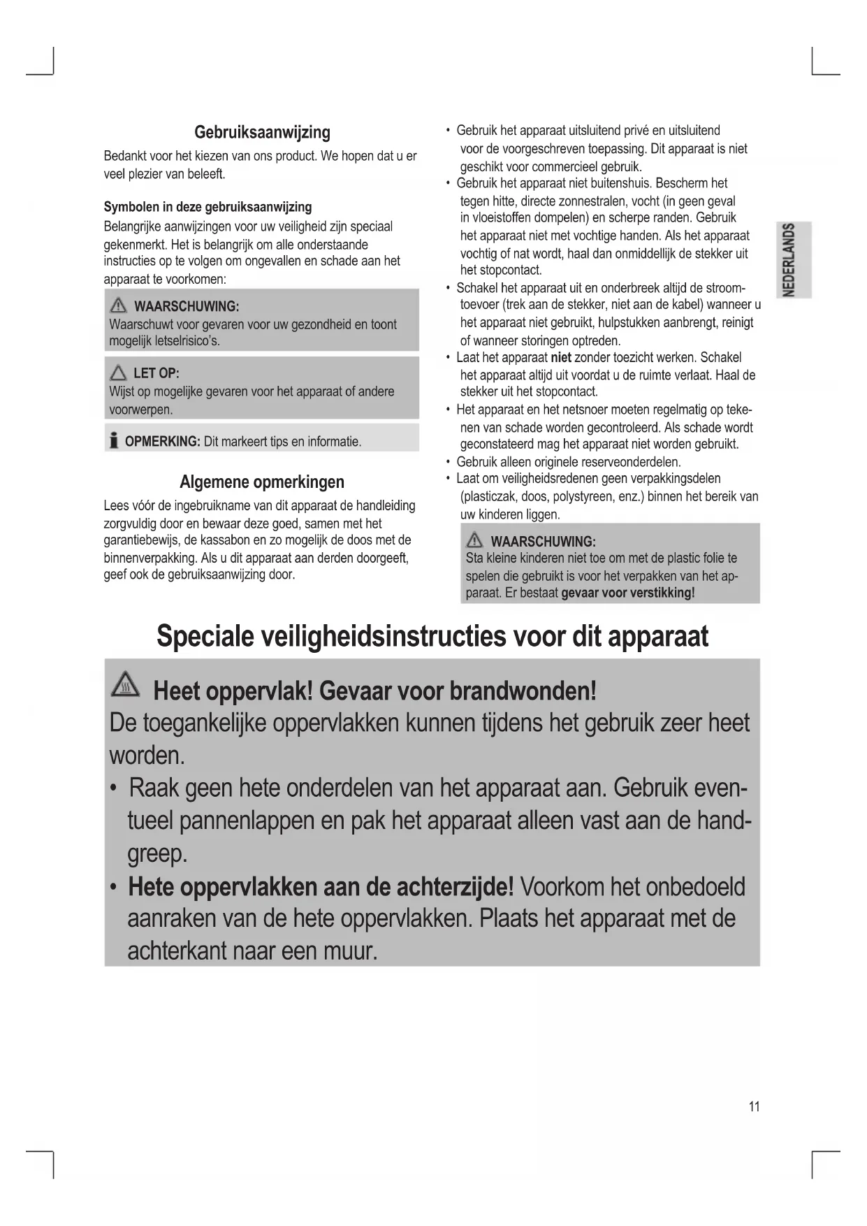 - Laat om veiligheidsredenen geen verpakkingsdelen (plasticzak, doos, polystyreen, enz.) binnen het bereik van uw kinderen liggen. WAARSCHUWING: Sta kleine kinderen niet toe om met de plastic folie te spelen die gebruikt is voor het verpakken van het ap- paraat. Er bestaat gevaar voor verstikking! Speciale veiligheidsinstructies voor dit apparaat Heet oppervlak! Gevaar voor brandwonden! De toegankelijke oppervlakken kunnen tijdens het gebruik zeer heet worden.