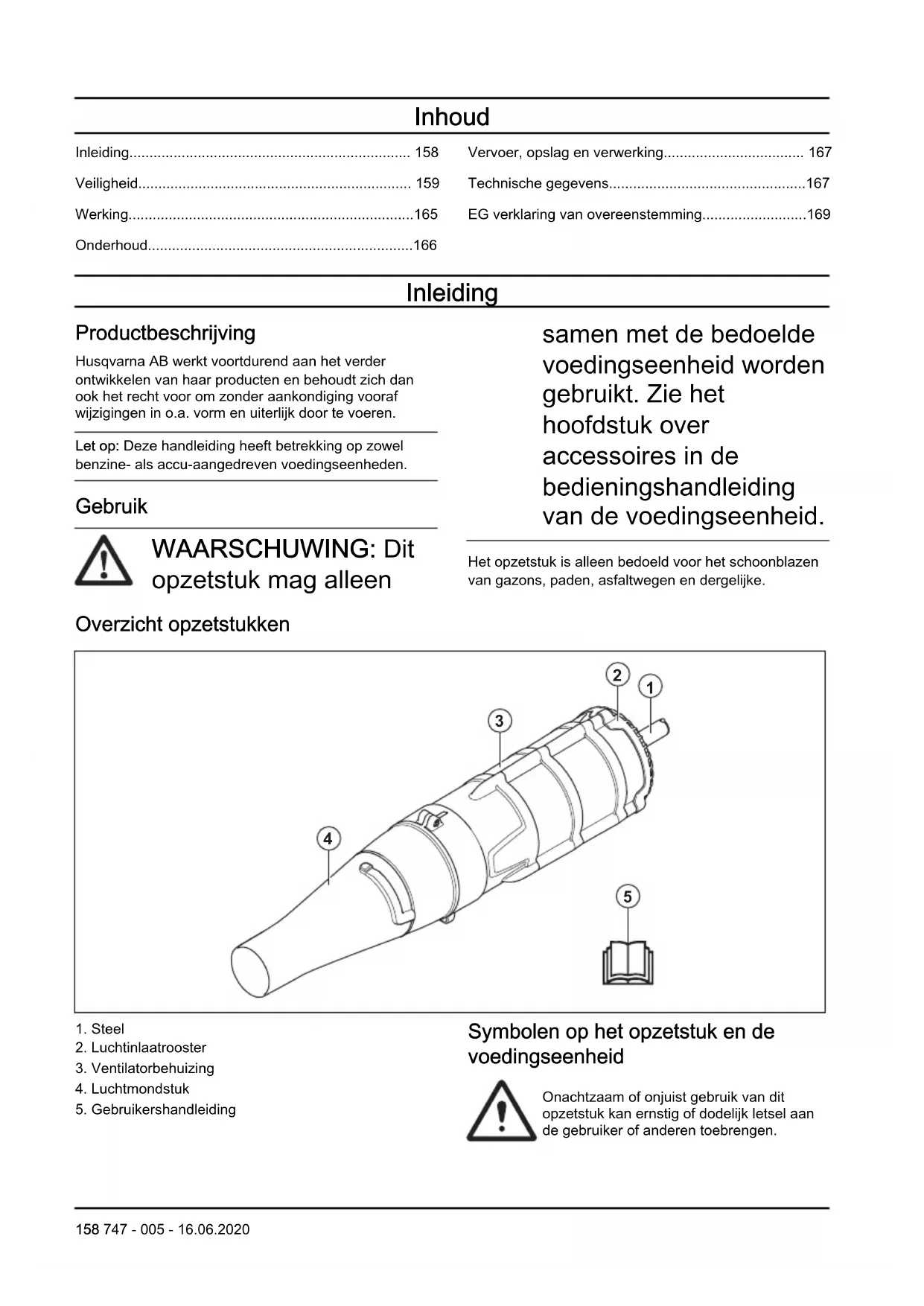 - EG verklaring van overeenstemming Inleiding Productbeschrijving Husqvarna AB werkt voortdurend aan het verder ontwikkelen van haar producten en behoudt zich dan ook het recht voor om zonder aankondiging vooraf wijzigingen in o.a. vorm en uiterlijk door te voeren. Let op: Deze handleiding heeft betrekking op zowel benzine- als accu-aangedreven voedingseenheden. Gebruik WAARSCHUWING: Dit opzetstuk mag alleen samen met de bedoelde voedingseenheid worden gebruikt. Zie het hoofdstuk over accessoires in de bedieningshandleiding van de voedingseenheid. Het opzetstuk is alleen bedoeld voor het schoonblazen van gazons, paden, asfaltwegen en dergelijke. Overzicht opzetstukken p. 169