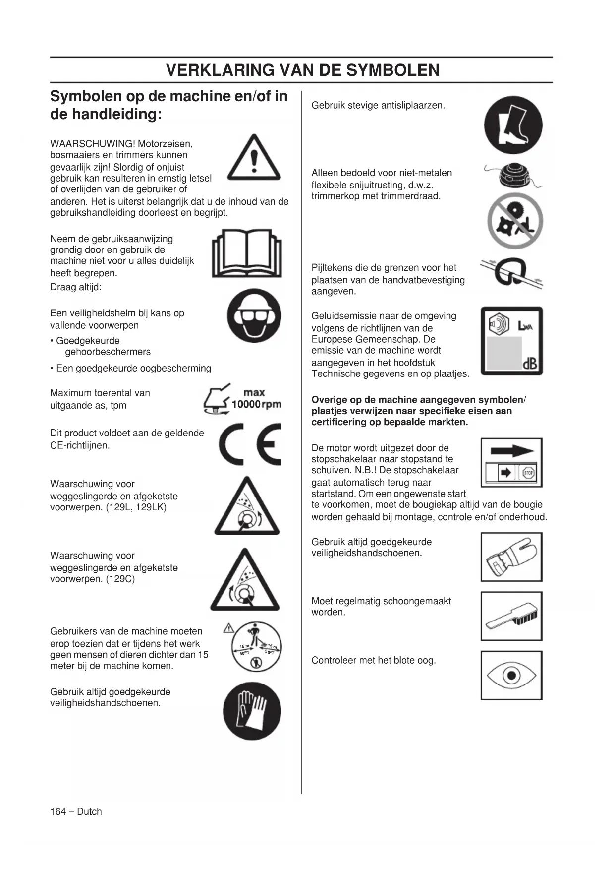 - Een goedgekeurde oogbescherming Maximum toerental van uitgaande as, tpm Dit product voldoet aan de geldende CE-richtlijnen. Waarschuwing voor weggeslingerde en afgeketste voorwerpen. (129L, 129LK) Waarschuwing voor weggeslingerde en afgeketste voorwerpen. (129C) Gebruikers van de machine moeten erop toezien dat er tijdens het werk geen mensen of dieren dichter dan 15 meter bij de machine komen. Gebruik altijd goedgekeurde veiligheidshandschoenen. Gebruik stevige antisliplaarzen. Alleen bedoeld voor niet-metalen flexibele snijuitrusting, d.w.z. trimmerkop met trimmerdraad. Pijltekens die de grenzen voor het plaatsen van de handvatbevestiging aangeven. Geluidsemissie naar de omgeving volgens de richtlijnen van de Europese Gemeenschap. De emissie van de machine wordt aangegeven in het hoofdstuk Technische gegevens en op plaatjes. Overige op de machine aangegeven symbolen/ plaatjes verwijzen naar specifieke eisen aan certificering op bepaalde markten. De motor wordt uitgezet door de stopschakelaar naar stopstand te schuiven. N.B.! De stopschakelaar gaat automatisch terug naar startstand. Om een ongewenste start te voorkomen, moet de bougiekap altijd van de bougie worden gehaald bij montage, controle en/of onderhoud. Gebruik altijd goedgekeurde veiligheidshandschoenen. Moet regelmatig schoongemaakt worden. Controleer met het blote oog.