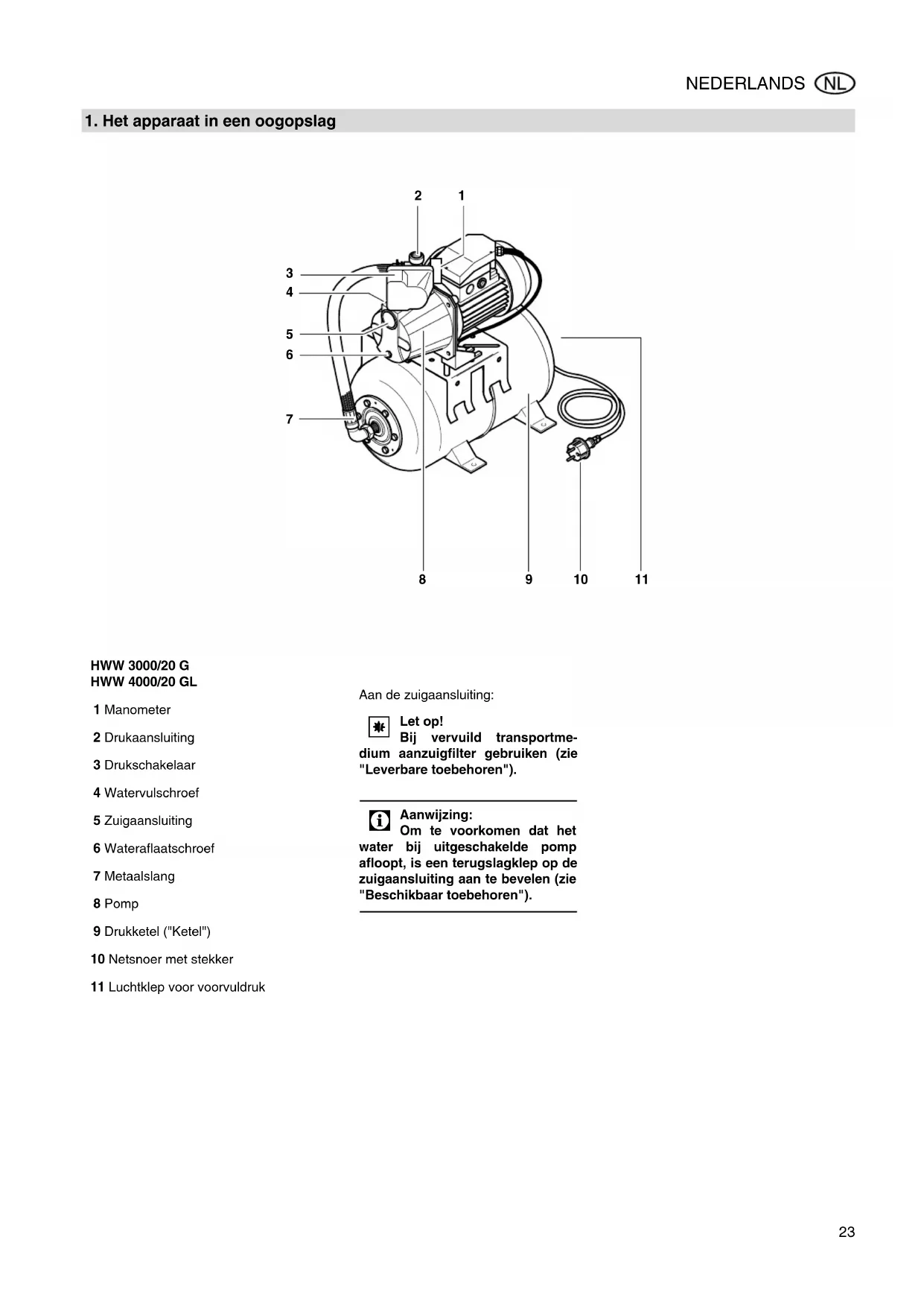 HWW 3000/20 G HWW 4000/20 GL 1 Manometer 2 Drukaansluiting 3 Drukschakelaar 4 Watervulschroef 5 Zuigaansluiting 6 Wateraflaatschroef 7 Metaalslang 8 Pomp 9 Drukketel ("Ketel") 10 Netsnoer met stekker 11 Luchtklep voor voorvuldruk Aan de zuigaansluiting: