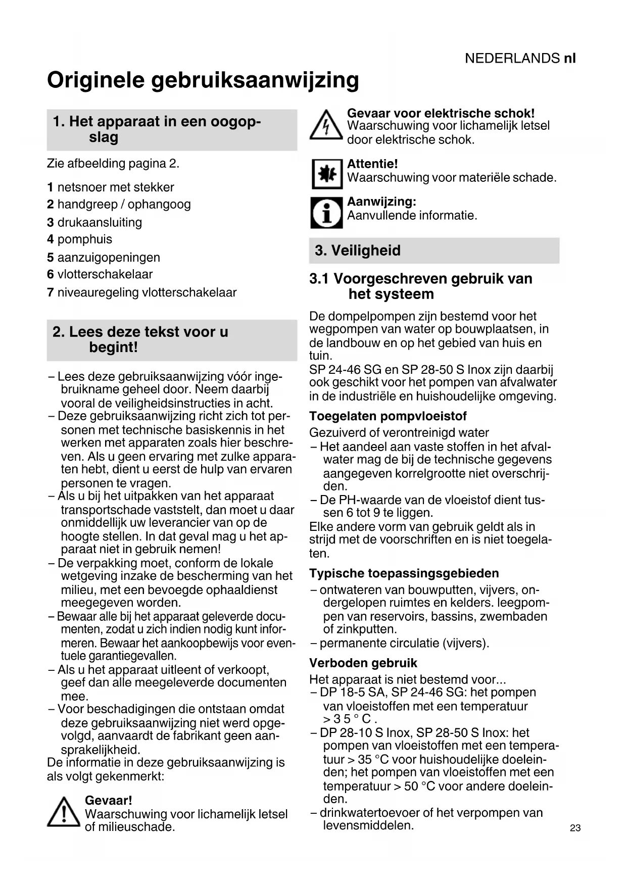 het systeem De dompelpompen zijn bestemd voor het wegpompen van water op bouwplaatsen, in de landbouw en op het gebied van huis en tuin. SP 24-46 SG en SP 28-50 S Inox zijn daarbij ook geschikt voor het pompen van afvalwater in de industriële en huishoudelijke omgeving. Toegelaten pompvloeistof Gezuiverd of verontreinigd water – Het aandeel aan vaste stoffen in het afval- water mag de bij de technische gegevens aangegeven korrelgrootte niet overschrij- den. – De PH-waarde van de vloeistof dient tus- sen 6 tot 9 te liggen. Elke andere vorm van gebruik geldt als in strijd met de voorschriften en is niet toegela- ten. Typische toepassingsgebieden – ontwateren van bouwputten, vijvers, on- dergelopen ruimtes en kelders. leegpom- pen van reservoirs, bassins, zwembaden of zinkputten. – permanente circulatie (vijvers). Verboden gebruik Het apparaat is niet bestemd voor... – DP 18-5 SA, SP 24-46 SG: het pompen van vloeistoffen met een temperatuur >35°C. – DP 28-10 S Inox, SP 28-50 S Inox: het pompen van vloeistoffen met een tempera- tuur > 35 °C voor huishoudelijke doelein- den; het pompen van vloeistoffen met een temperatuur > 50 °C voor andere doelein- den. – drinkwatertoevoer of het verpompen van levensmiddelen.